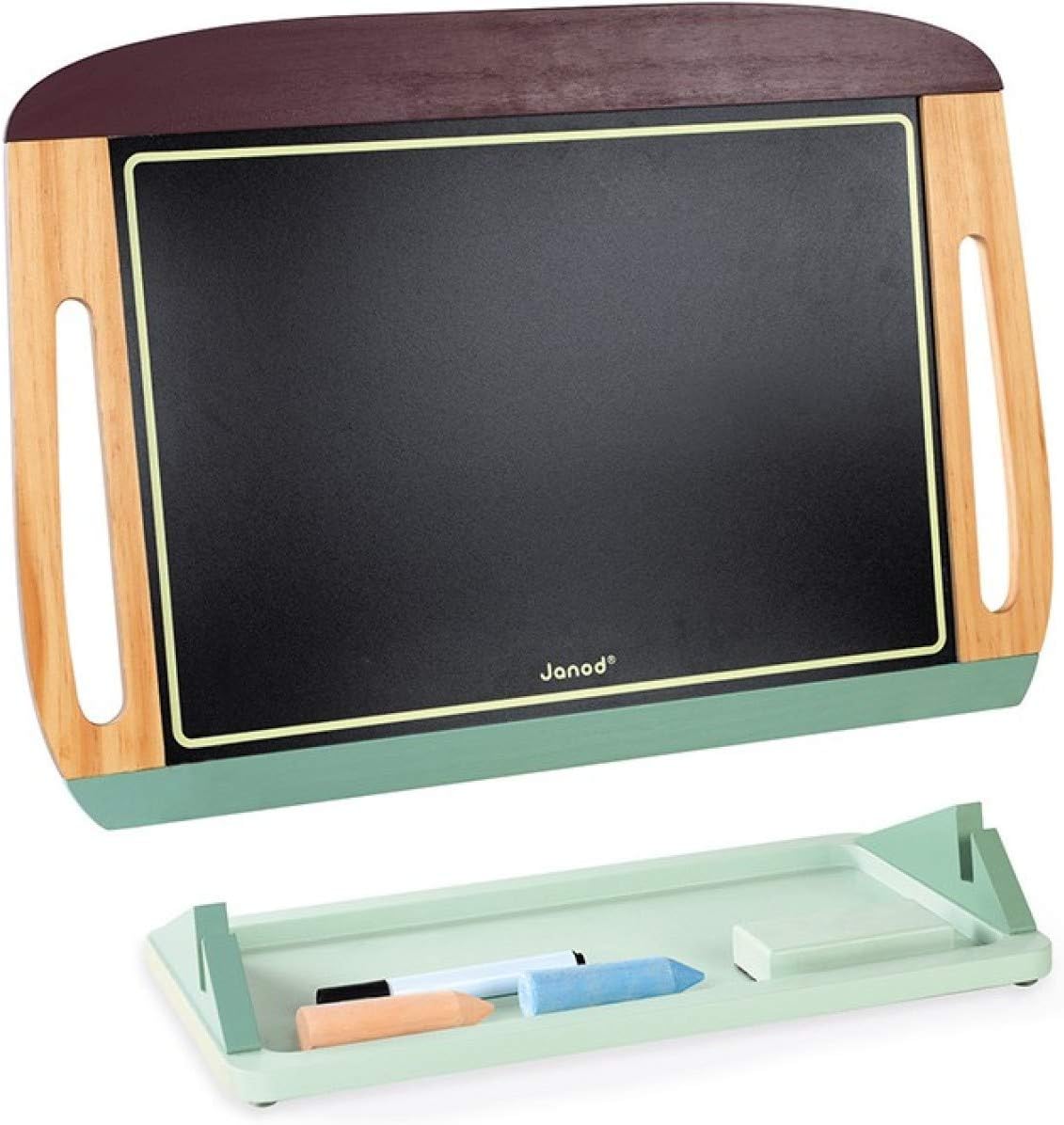Thanks to this double-sided Janod slate, children from 3 to 8 years old can use an ideal educational tool for learning to write and learn numbers. Playful, this slate is also ideal for playing, drawing, erasing, and starting all over. With its large A3 format, it offers a large drawing and writing surface, for optimal user comfort for children. The non-slip base ensures the stability of the slate, and allows use in any room of the house. The black side can be used with chalk, and the white magnetic erasable side can be used with a marker. Accessories included: two large chalks, an erasable marker and a brush. Writing surface: A3 format, 16.5 x 11.7 inches.Contains one double-sided slate (slate for felt, slate for chalk), two large chalks, one erasable marker, one brush. Toy dimensions : Length 21.1 inches x Width 9.1 inches x Height 15.9 inches. Material(s) used : Wood (MDF + pine). Recommended age range : from 3 to 8 years old