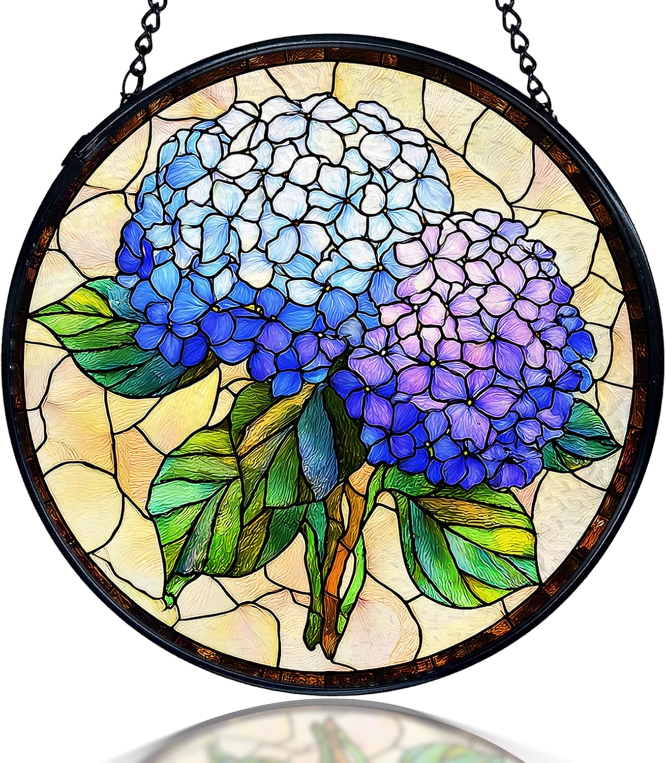 This round stained glass sun catcher adds a decorative touch to windows, walls, or indoor areas where natural or indoor light can pass through. Crafted from real stained glass with a lightly textured surface and a smooth back, it brings a soft play of color as light filters across. The piece measures 7.9 inches in diameter and is framed with a metal edge for added support. A matching chain and hook are included for easy hanging in different spaces.