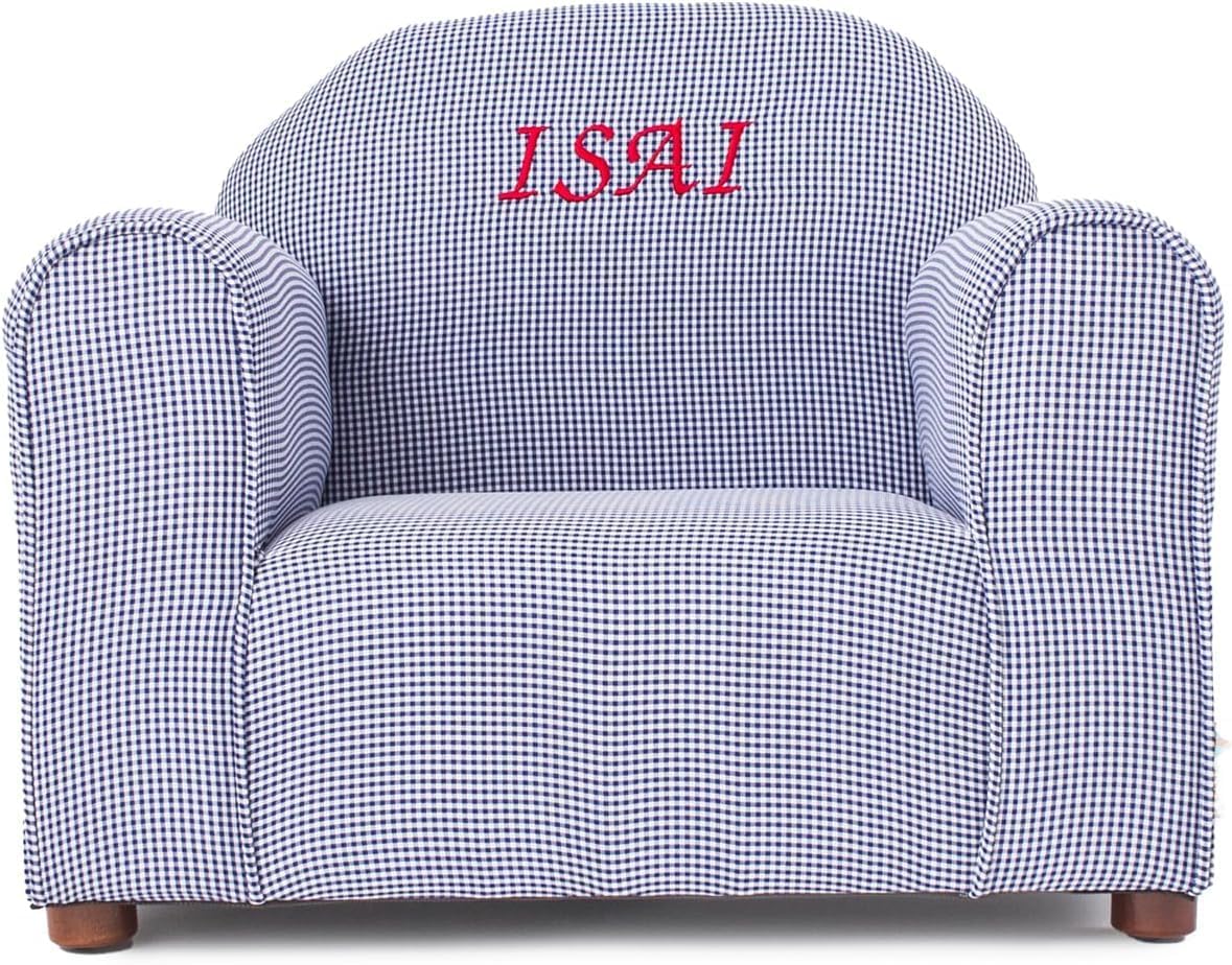 The KEET Personalized Mini Chair Gingham is a beautifully crafted and customizable armchair designed exclusively for toddlers aged 2 to 5. Made in Tijuana, Mexico with premium materials and featuring expert craftsmanship, this kids chair combines comfort, safety, and style into one delightful piece of furniture. The solid wooden frame ensures a strong and stable base, while the high-density foam cushioning provides a plush and ergonomic seat your child will love. Upholstered in durable and easy-to-clean gingham-patterned microsuede fabric, this chair is both kid-proof and parent-friendly. The personalized embroidery adds a special touch, allowing you to customize the chair with your child’s name (up to 12 characters) in your choice of thread color and font style. It’s the perfect gift for birthdays, holidays, baby showers, or simply to create a cozy reading and play nook. Whether placed in a bedroom, nursery, playroom, or family living area, this toddler chair blends effortlessly with classic or modern décor while giving children a sense of ownership and pride. Parents will appreciate the washable removable cover, which makes cleaning a breeze. The low height and rounded armrests ensure it’s safe and accessible for little ones to climb in and out with ease. Proudly designed in California and built in North America, the KEET Personalized Mini Chair Gingham provides a timeless, elegant seating solution that supports growing toddlers while making lasting memories. It arrives fully assembled and ready to use—right out of the box.