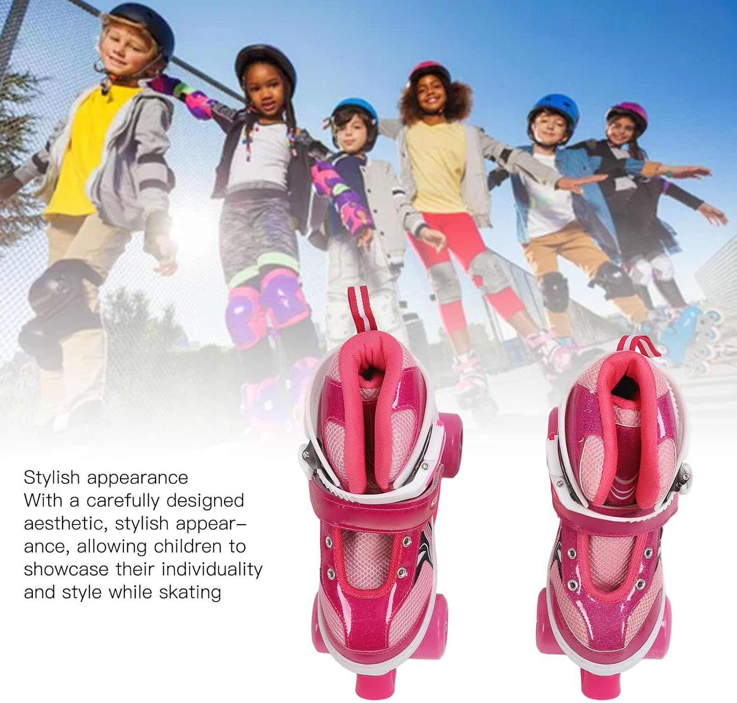 [COMFORTABLE AND DURABLE PVC] These kids roller skates are made with premium PVC material, providing a comfortable fit and high abrasion for long-lasting wearability.[STABLE FOUR WHEEL DESIGN] Equipped with excellent four wheels, these roller skates offer stable support and a smooth gliding experience, for beginners to learn and enjoy.[ENHANCED PROTECTION AND COMFORT] Featuring a soft interior lining, these roller skates ensure protection and enhanced comfort for children's feet, making them convenient and practical to use.[STYLISH APPEARANCE] With carefully designed aesthetics, these kids roller skates make children stand out and showcase their individuality and style, adding a fashionable touch to their skating experience.[VERSATILE USAGE] These roller skates can be used for skating, outdoor rollerblading, and various activities, providing children with a multifunctional option to cater to their different needs and interests.Spec:Item Type: Kids Roller SkatesMaterial: PVC, meshWeight: Approx. 2385g/84.1ozSuitable Foot Length: 210mm to 235mm/8.3in to 9.3inSuitable Size: 33 to 37Package List:1 Pair x Roller Skates1 x Storage BagNote: