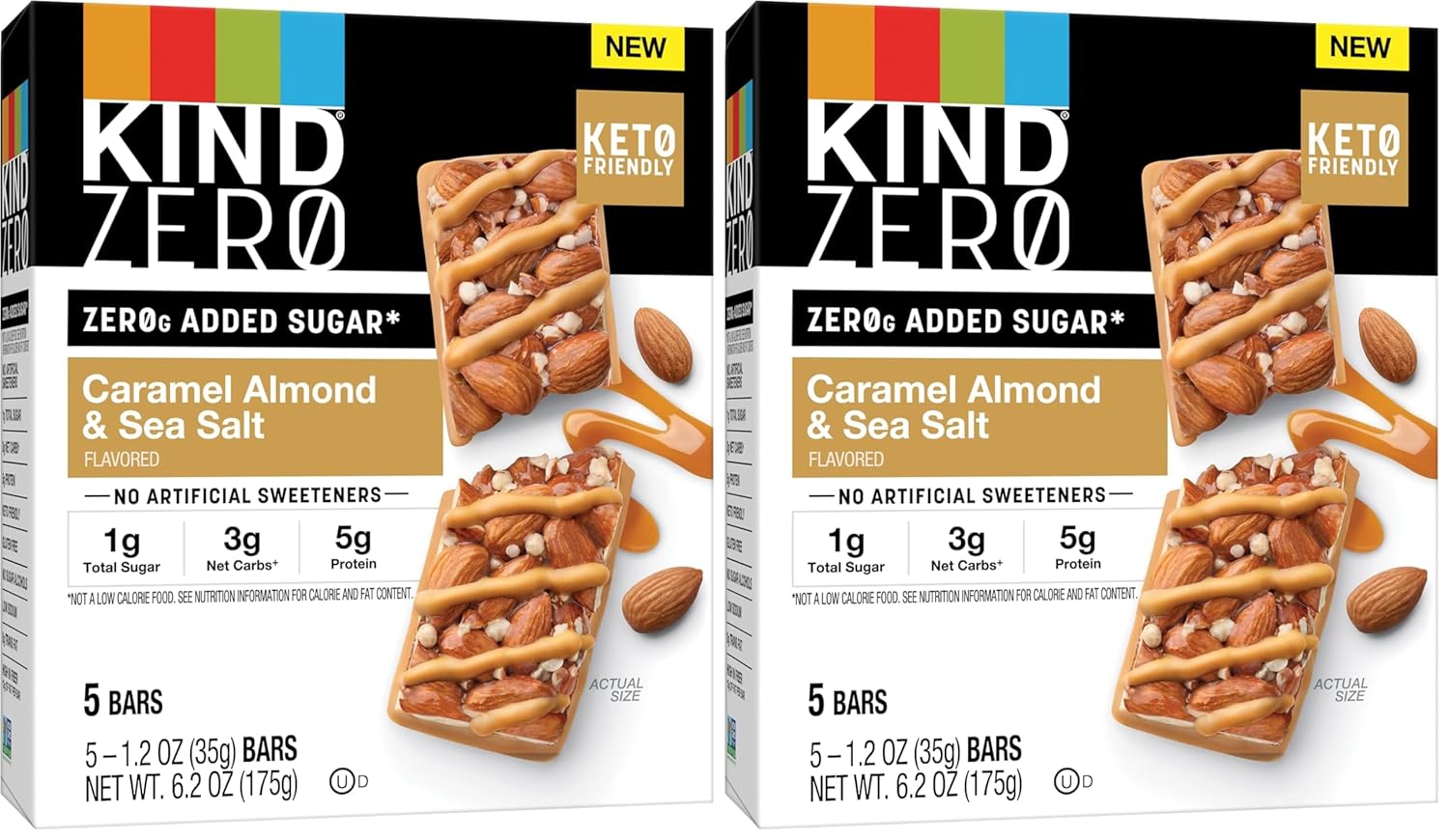 KIND ZERO Added Sugar Bars are a tastier way to enjoy keto friendly snacking. Includes one, 6.2-ounce box of five individually wrapped nut bars with a combination of 3g net carbs, 5g protein, 1g total sugar and 0g added sugar* per serving. Each nut bar is made with premium, whole ingredients you can see and pronounce, and has the perfect balance of sweetness. Every bite brings together nutrient-dense almonds and peanuts, plus chocolatey top drizzle and bottom coating for uncompromisingly delicious taste. What you won�t find is artificial sweeteners or sugar alcohols. Keep our ZERO Added Sugar KIND Bars on hand for an easy mid-morning snack food. Grab a keto friendly snack bar as a quick bite between meetings or errands. Enjoy as part of your pre workout routine. For mornings, snack time or any time, make KIND ZERO Added Sugar Bars a delicious, nutritious addition to your keto friendly journey. *Not a low-calorie food. See nutrition information for calorie and fat content.