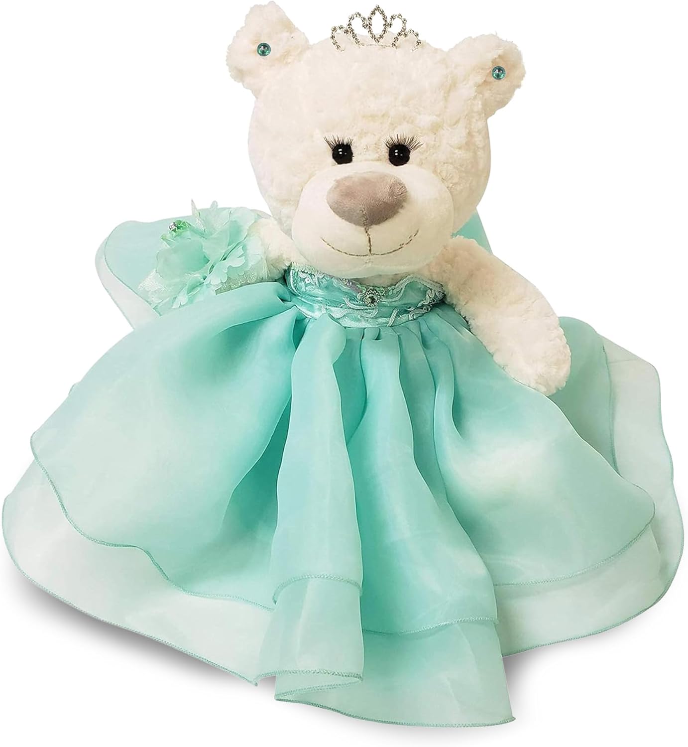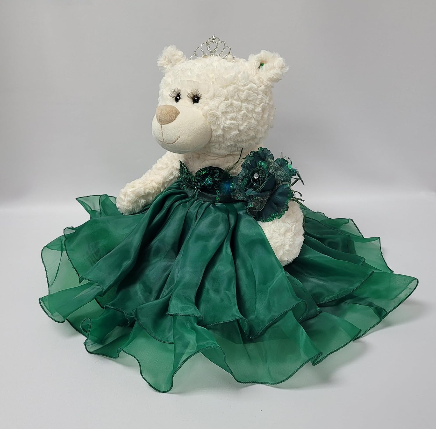 For those looking for something other than a traditional doll, this Beautiful and Elegant Quince Bear Centerpiece offers a unique and meaningful way to celebrate her special day. Measuring 20 inches tall, this crème-colored quinceañera bear is designed as a decorative keepsake and dressed in a glamorous gown created to stand out as both a gift and table centerpiece (centro de mesa para quinceañera). The bear features long curled lashes for a graceful, expressive look, while the bodice of the dress is adorned with shimmering sequins and a full layered skirt that creates an elegant quinceañera silhouette. Adding a personal and traditional touch, the bear’s right leg is embroidered with “Mis 15 Años.” Each quince bear comes fully accessorized with a sparkling rhinestone tiara, delicate earrings, and a matching wrist bouquet, making it presentation-ready for the celebration. Perfect as a quinceañera centerpiece, decorative display, or mis 15 gift (regalo para quinceañera), this piece is a memorable alternative to a doll and a lasting reminder of her quinceañera milestone. Designed by Latinas in California with a deep appreciation for quinceañera traditions, this quinceañera bear reflects authentic style and careful attention to detail. The gown is crafted using dress-quality satin and layered organza inspired by traditional quinceañera gowns, offering an elevated finish suitable for display and keepsake purposes. Intended for decorative use only. Recommended for ages 14 and up.