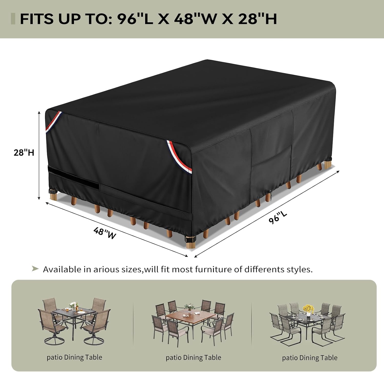 • Why won’t it leak water? The upgraded material has passed a strict water pressure test and a surface water repellent test, and its double needle and heat sealing technology can keep your furniture dry on rainy days and extend its lifespan; Place some items under the patio table furniture covers to raise them and keep water from pooling