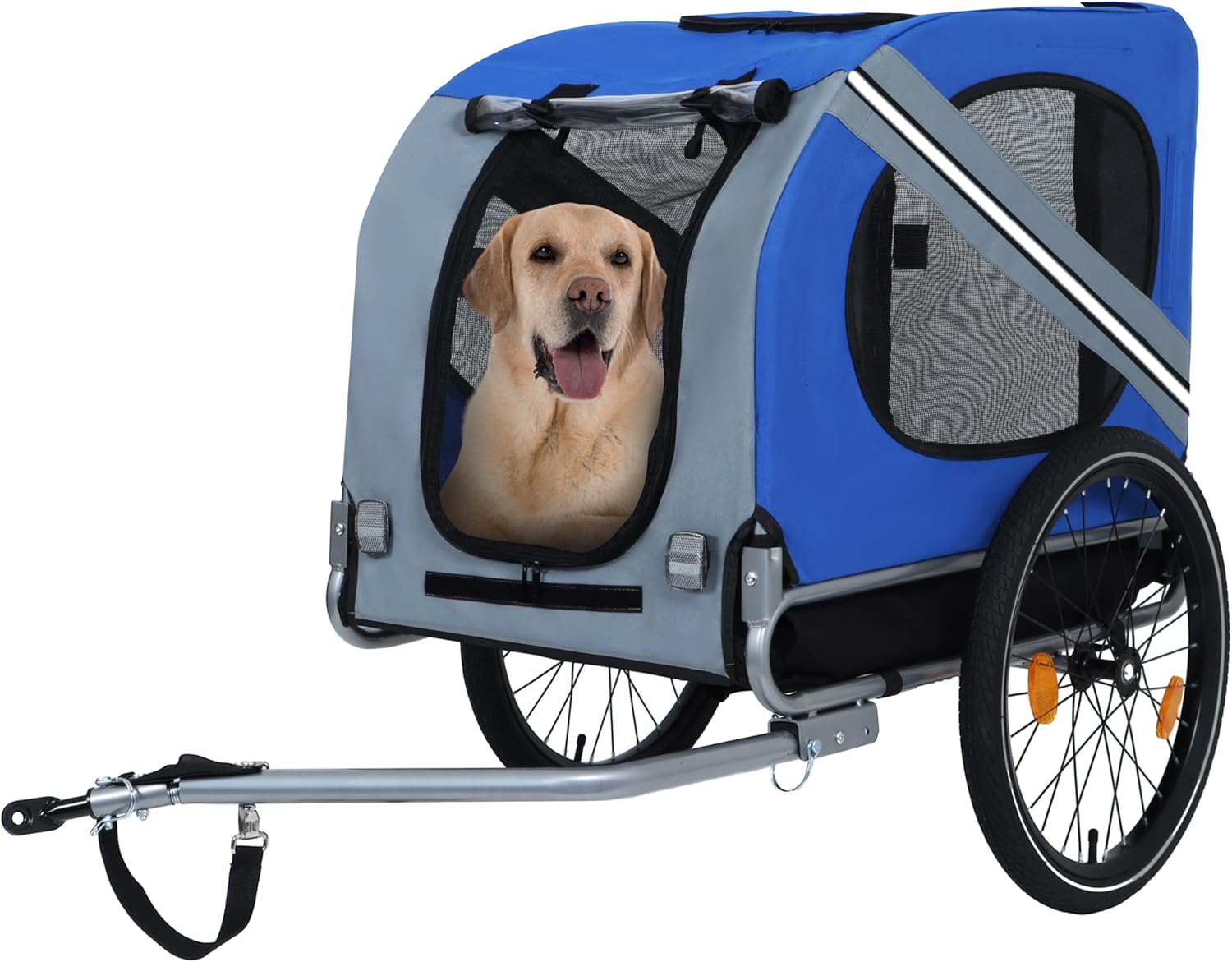 This pet trailer, made of tough Oxford fabric and a sturdy steel frame, is durable against bad weather and water. Its roomy interior suits small to medium dogs like Beagles. It keeps pets safe. It's partially pre - assembled, has a 20 - inch quick - release wheel and tools for easy setup. The fold - flat frame is great for storage. Three zippered entrances and mesh windows ensure comfort and air flow, while a D - ring leash anchor secures pets. The removable hitch attaches easily to bikes with 24+ inch rear axles via a quick - connect pin. 20 - inch air - filled tires give a smooth ride, a PVC rain cover keeps out rain, reflective strips boost visibility, and a roll - up front panel lets pets enjoy the view. Ideal for active pet owners on bike rides, jogs, or outdoor trips.