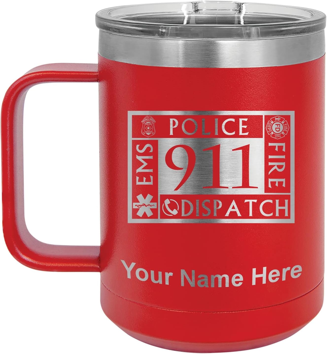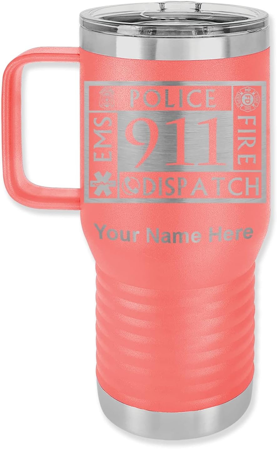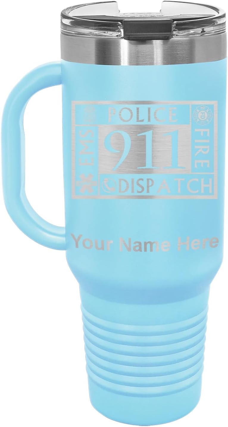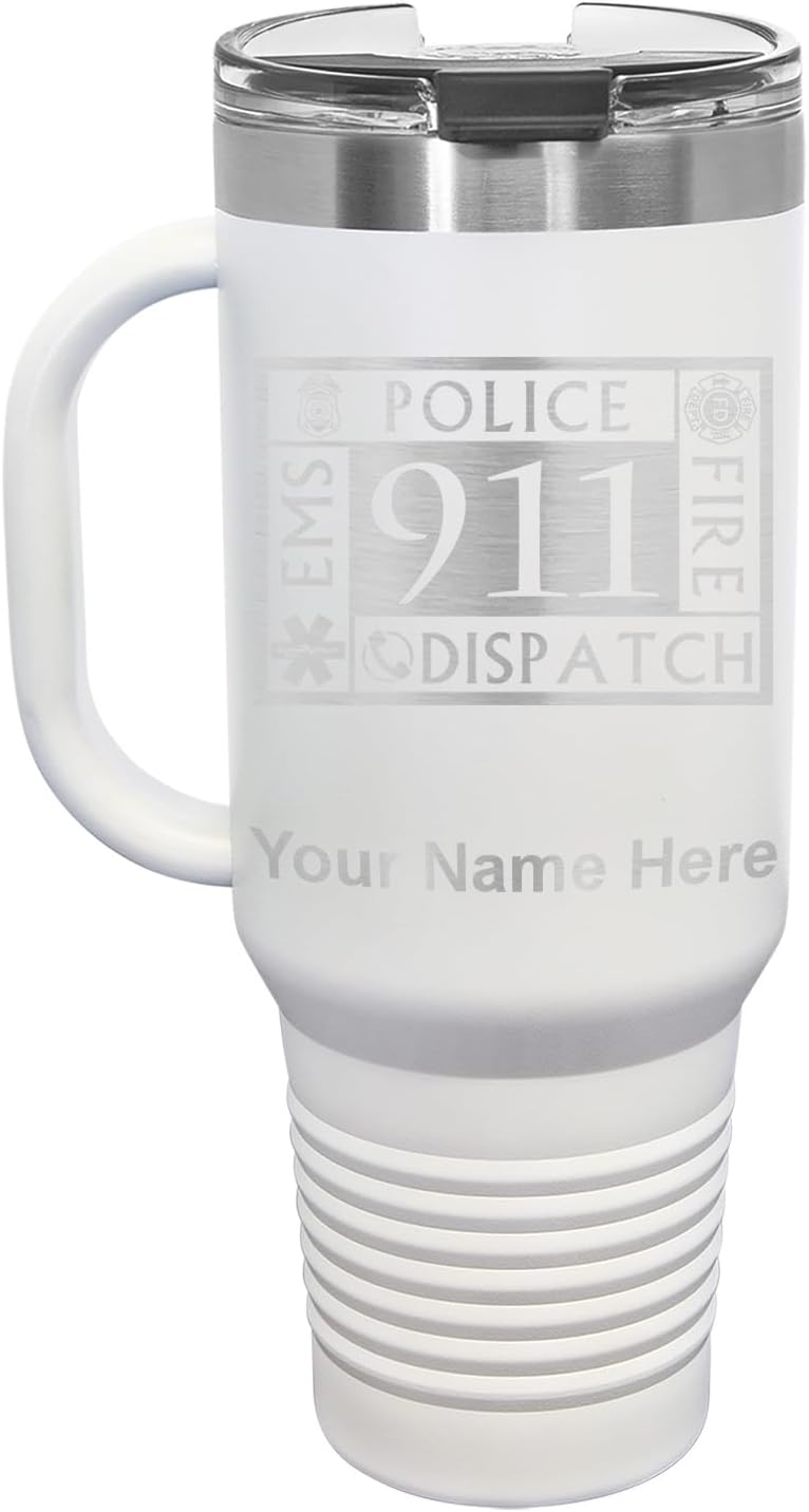 LaserGram 40 ounce Travel Mug with Handle that is laser engraved with the image that you see in the photo. Your own personalized text will be laser engraved below the image. Features double-walled stainless steel vacuum insulation with a clear lid. Click the "Customize Now" button to begin customizing your mug.
