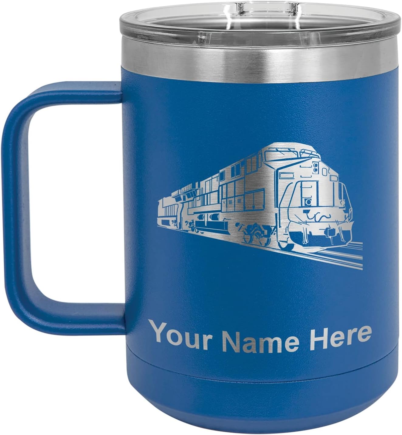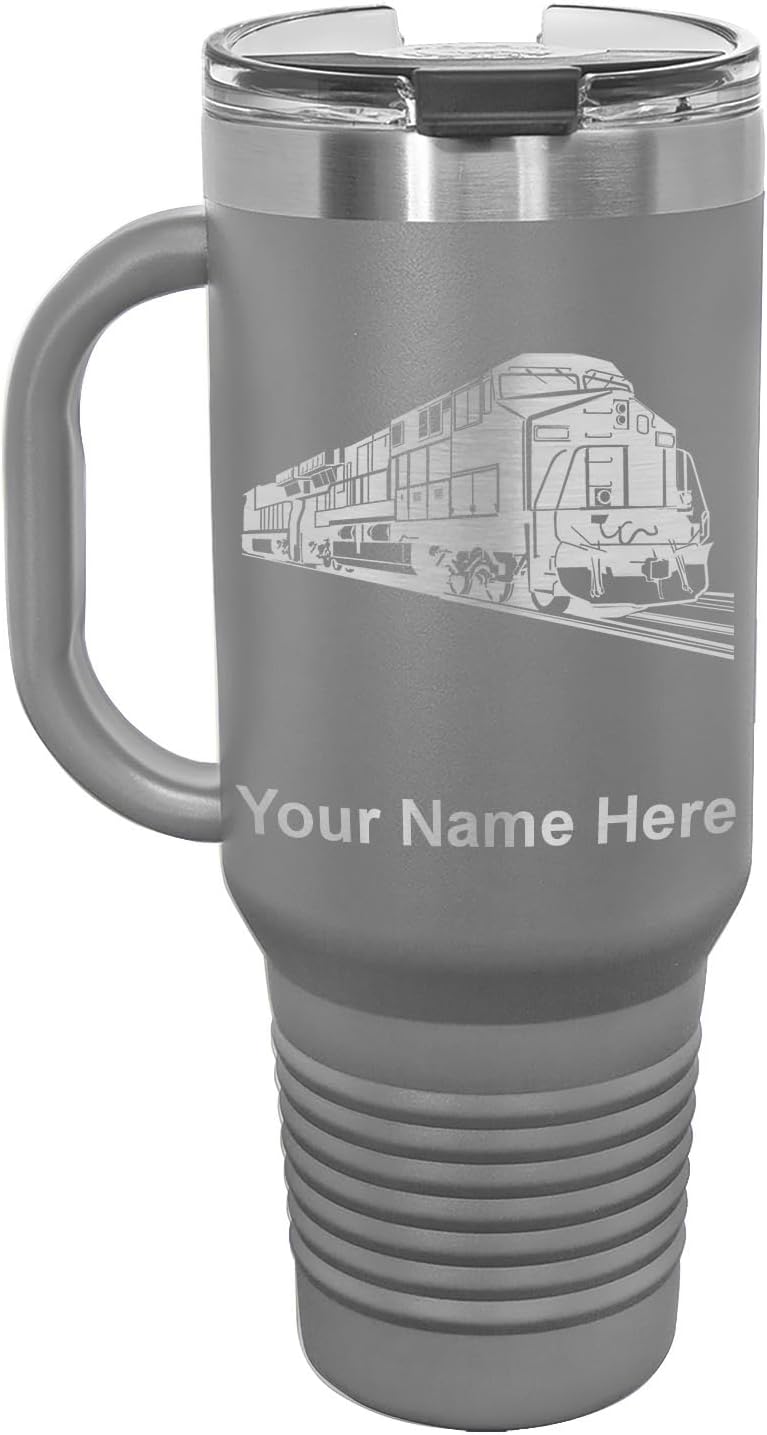 LaserGram 40 ounce Travel Mug with Handle that is laser engraved with the image that you see in the photo. Your own personalized text will be laser engraved below the image. Features double-walled stainless steel vacuum insulation with a clear lid. Click the "Customize Now" button to begin customizing your mug.