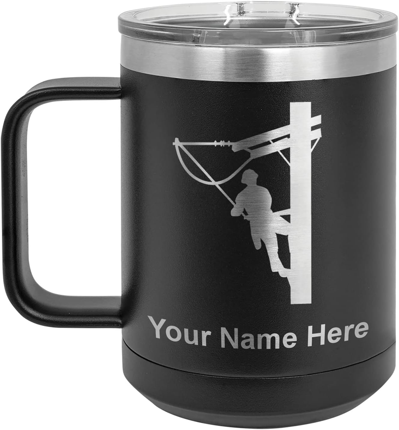 LaserGram 40 ounce Travel Mug with Handle that is laser engraved with the image that you see in the photo. Your own personalized text will be laser engraved below the image. Features double-walled stainless steel vacuum insulation with a clear lid. Click the "Customize Now" button to begin customizing your mug.