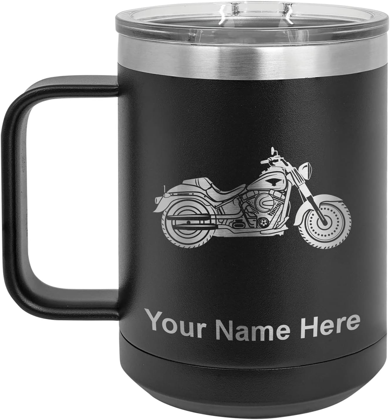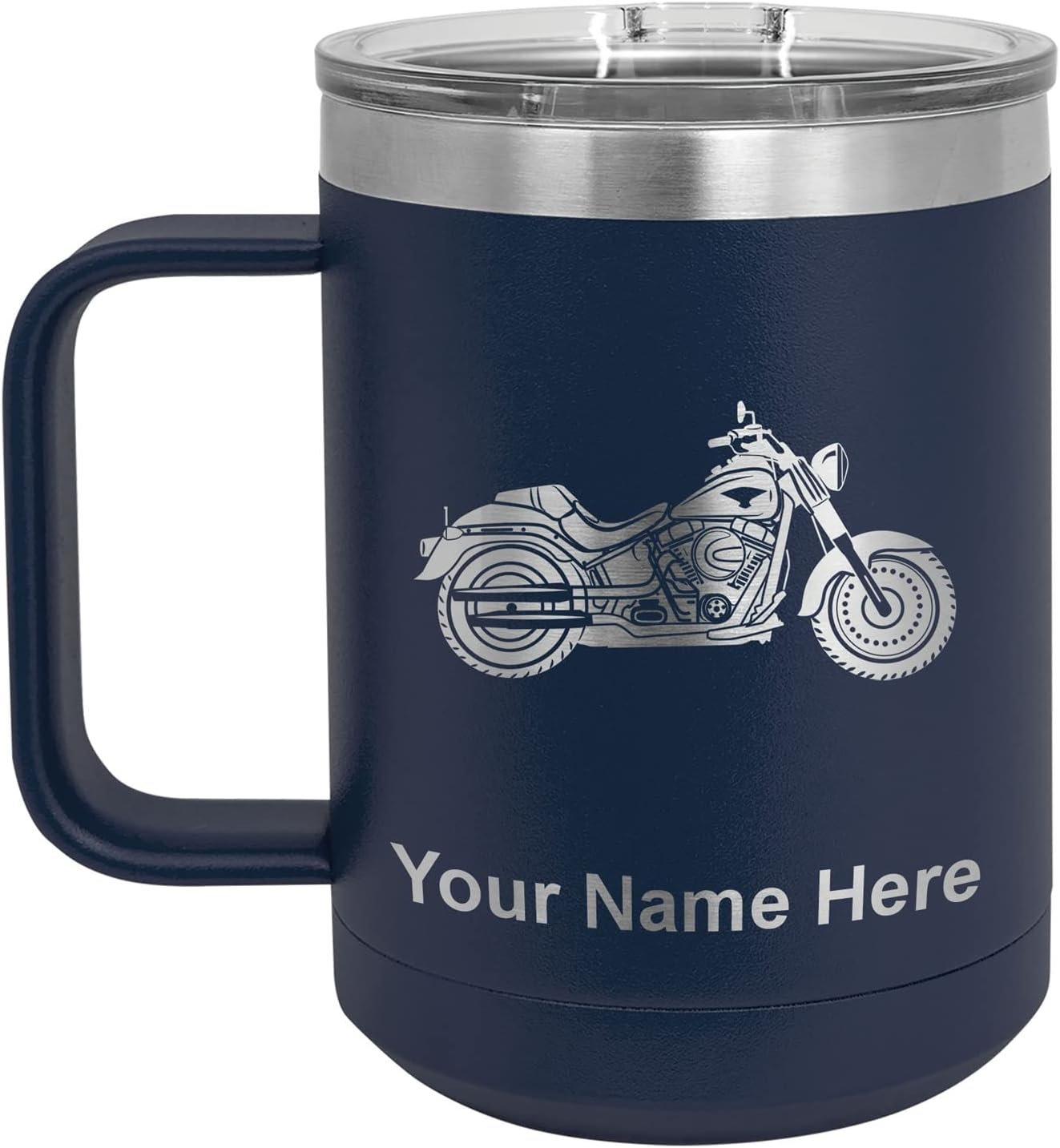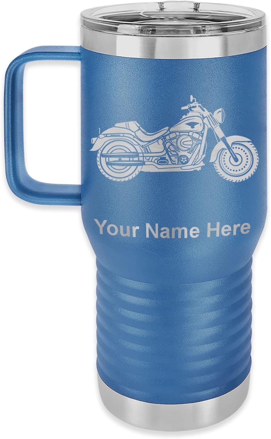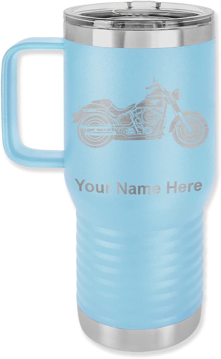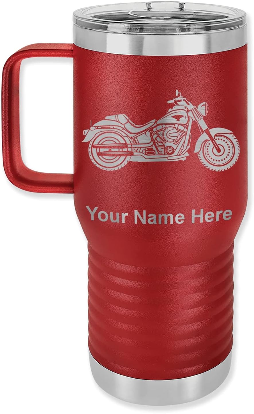 LaserGram 40 ounce Travel Mug with Handle that is laser engraved with the image that you see in the photo. Your own personalized text will be laser engraved below the image. Features double-walled stainless steel vacuum insulation with a clear lid. Click the "Customize Now" button to begin customizing your mug.