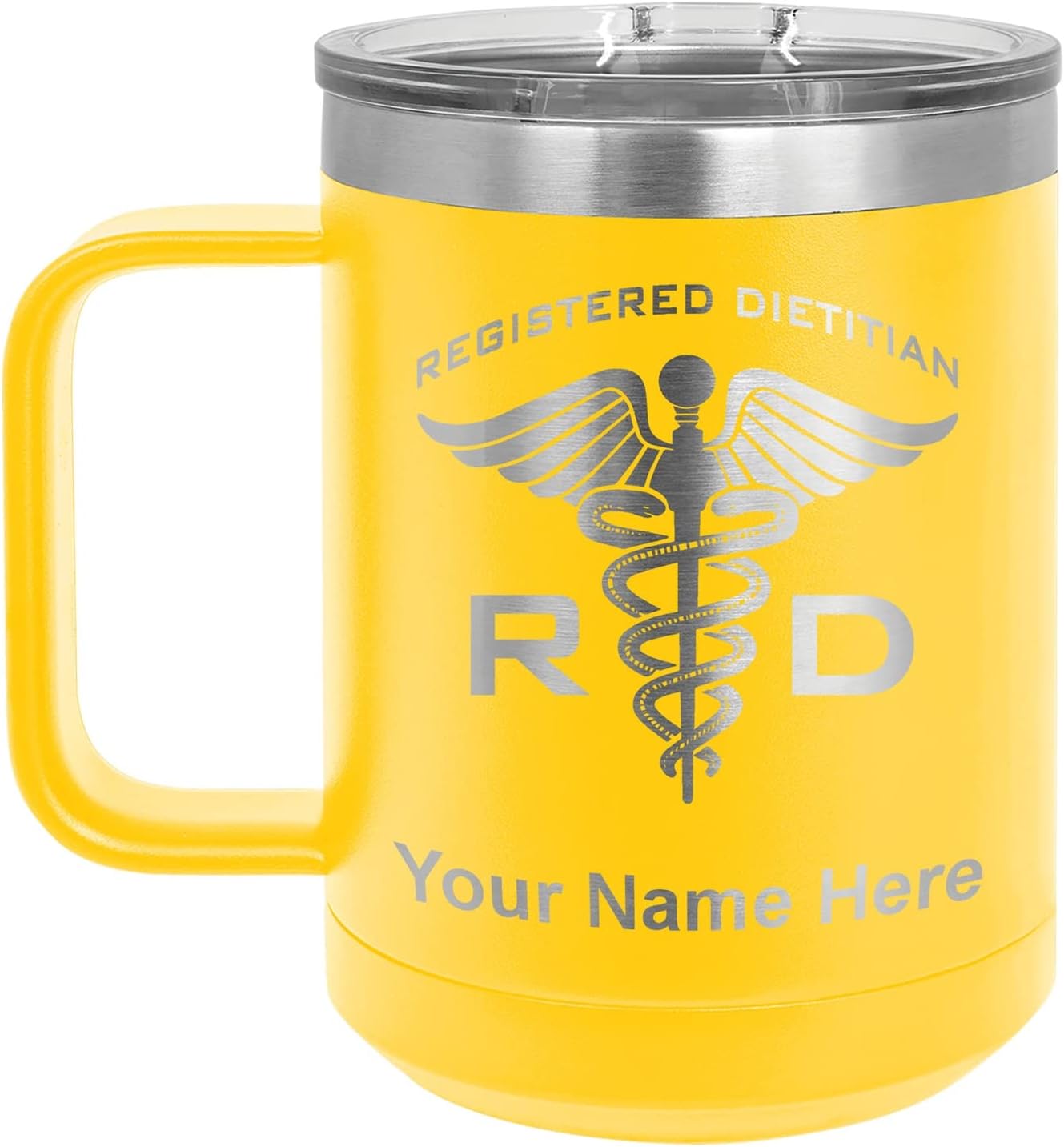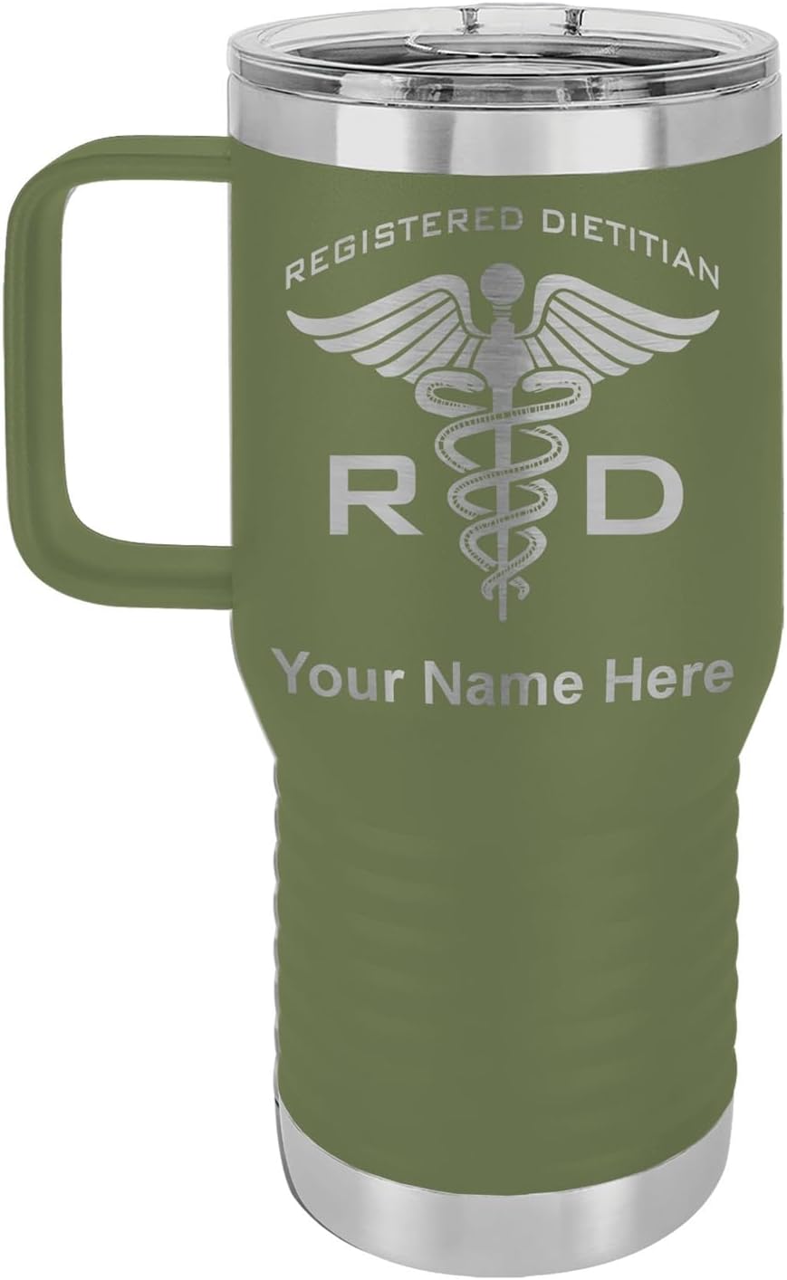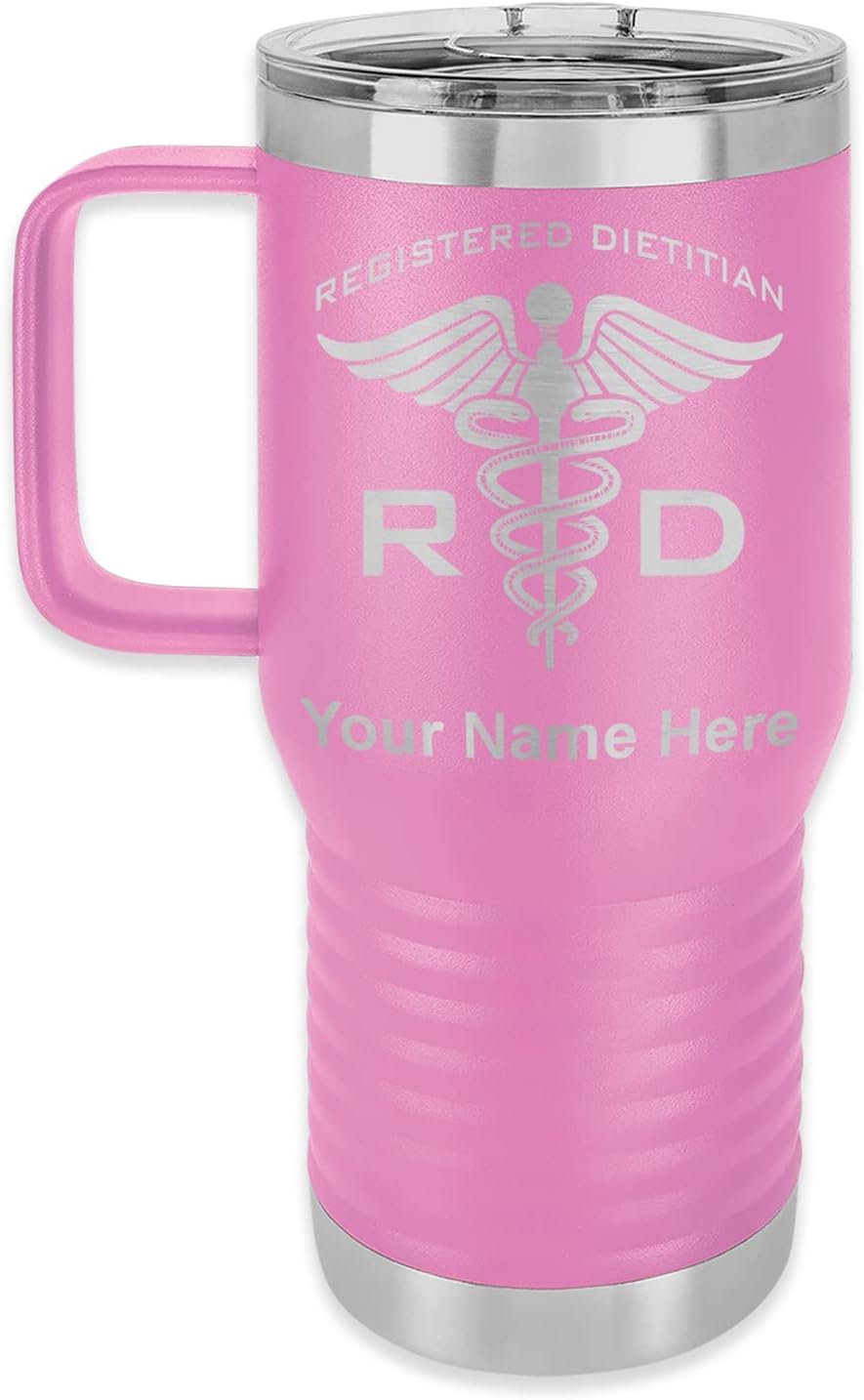 LaserGram 40 ounce Travel Mug with Handle that is laser engraved with the image that you see in the photo. Your own personalized text will be laser engraved below the image. Features double-walled stainless steel vacuum insulation with a clear lid. Click the "Customize Now" button to begin customizing your mug.