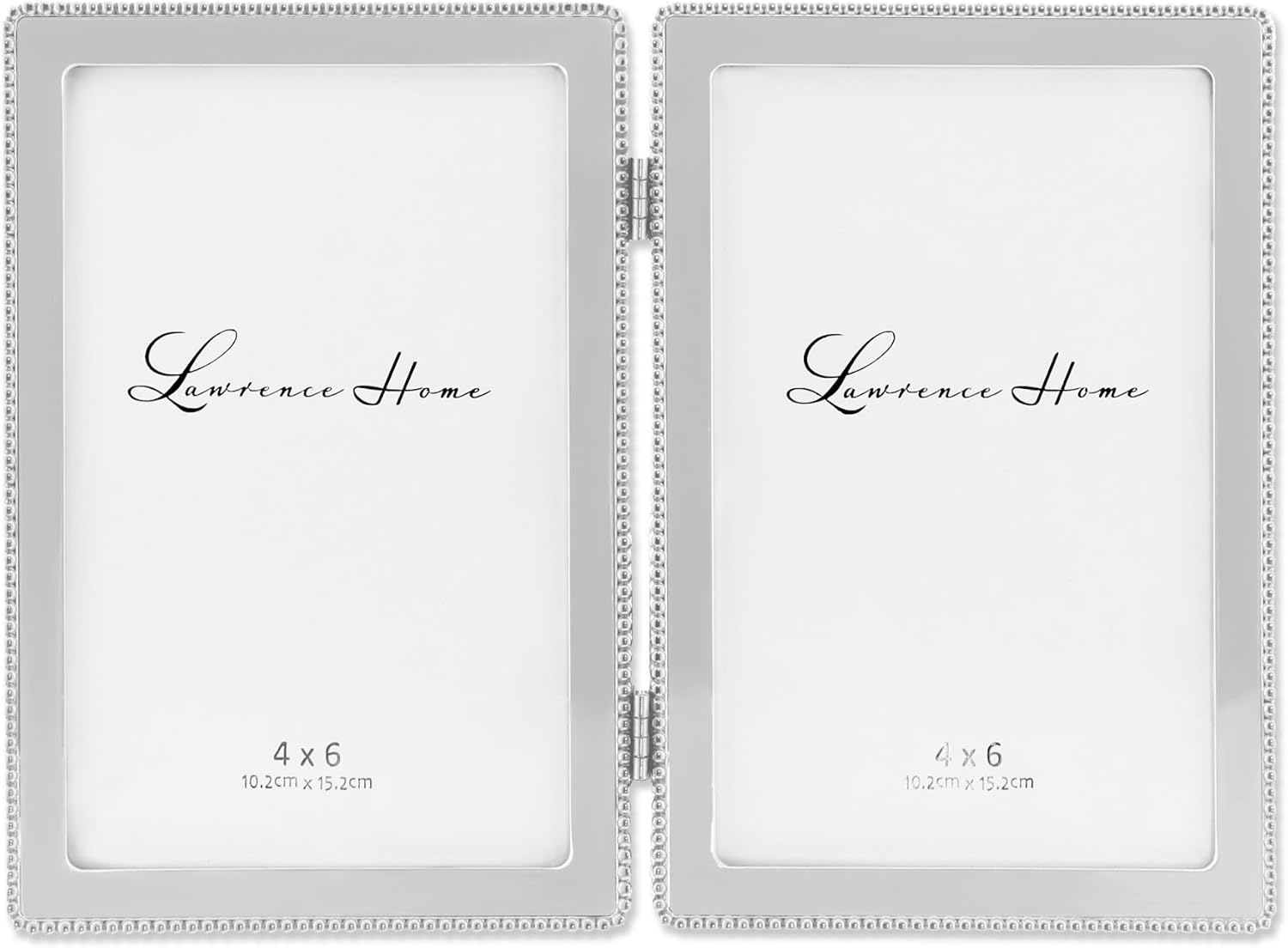 Gorgeous decorative silver metal picture frame with a delicate bead outer border. This polished silver metal frame has a rich and lustrous silver finish. High quality black velvet backing with easel for vertical or horizontal tabletop display and comes with hangers for vertical or horizontal wall mounting. Heavy weight cast metal picture frame is made with exceptional workmanship and comes individually boxed. In this style the 8x10 size comes with a white acid free bevel cut mat for a 5x7 photo.