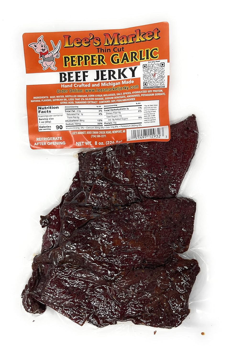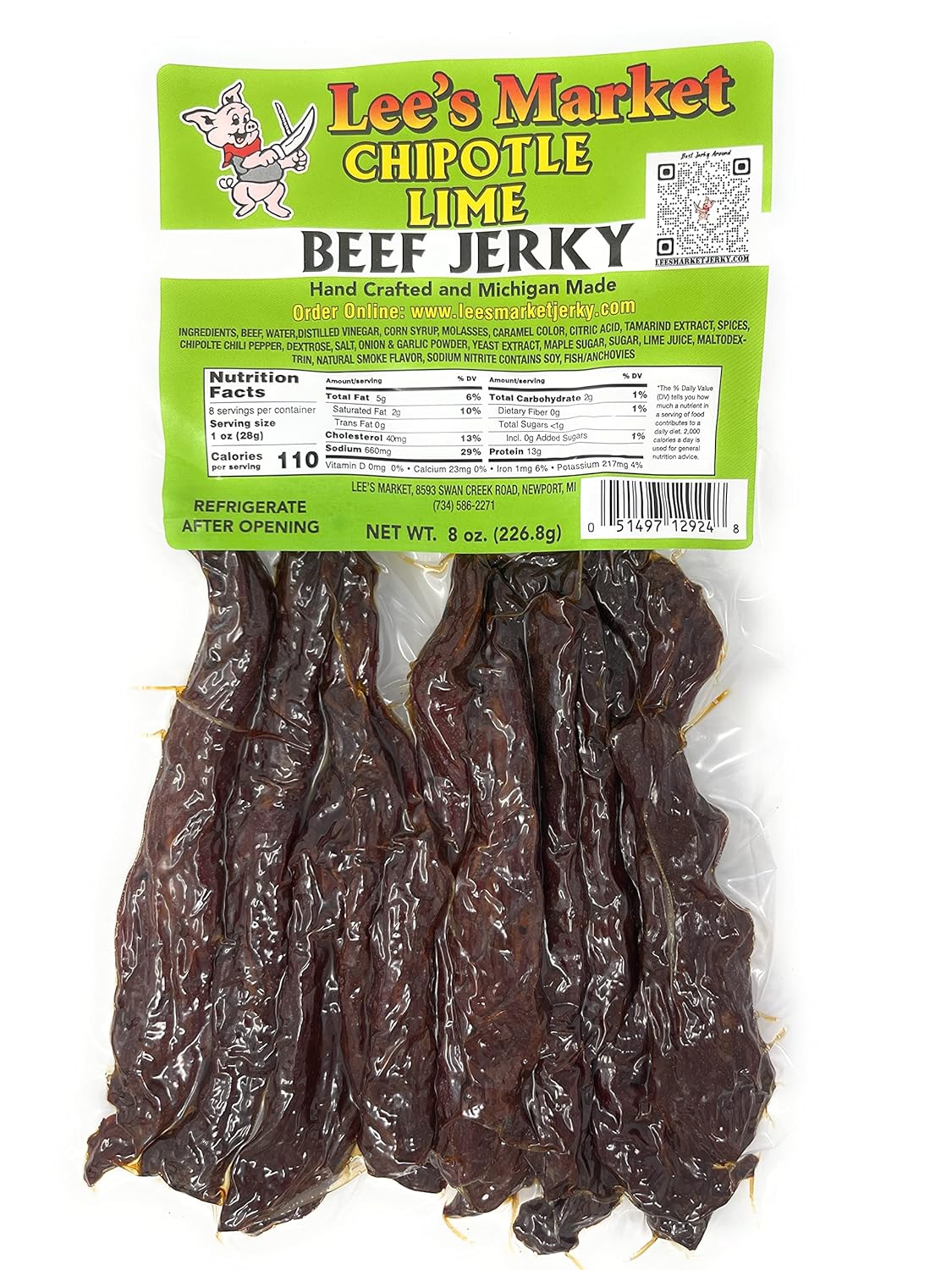 Lee's Market Beef Jerky - 8oz PacksGet superior quality and the freshest sweet, spicy, smokey, & savory flavors in every 8oz bag!Handcrafted in Michigan, Lee's Market Jerky's wide selection of healthy, protein-packed beef jerky strips are a tender, tantalizing treat for the tastebuds! Unlike other jerkies that use fillers, our jerky is made with 100% USDA-approved beef for a healthy, meaty snack that is free of gluten and low in carbs but tastes utterly indulgent. Loaded with 14g of protein per 1oz serving, our paleo- and keto-friendly beef jerkies will keep you fueled up for any adventure, satisfying even the most ravenous meat-eaters!Premium Ingredients, Fresh FlavorLee's Market Jerky is crafted with only the most flavorful, high-quality spices and ingredients. Each mouthwatering batch of hand-trimmed and house-brined seasoned gourmet beef jerky is made fresh daily here in the USA.Tastes You CraveFrom the right balance of smoke, flavor, and tenderness to the blend of premium seasonings carnivores will crave, Lee's Market has something for every unique palate. Choose from our range of crave-worthy beef jerky varieties, including:Original, Pepper Garlic, Teriyaki, Cajun, Honey BBQ, Maple Jalapeno, Buttery Prime Rib, Ghost Pepper, Chipotle, Double Smoke, Low Sodium and many more to satiate your carnivorous cravings.Our sealed packages are shelf-stable for 6 months making Lee's Market traditional beef, poultry, big/wild game, and exotic artisanal jerkies the perfect on-the-go meaty snack companions for the road, trail, or out on the water.Lee's Marketis a family-operated small business founded in 1962 on the premise of providing quality products at a convenience to customers in Newport, Michigan. In 1990, Lee's only son took over the market and started hand-crafting beef jerky. Over 30 years we have grown to be a staple for, what many customers believe to be the "Best Jerky Around".