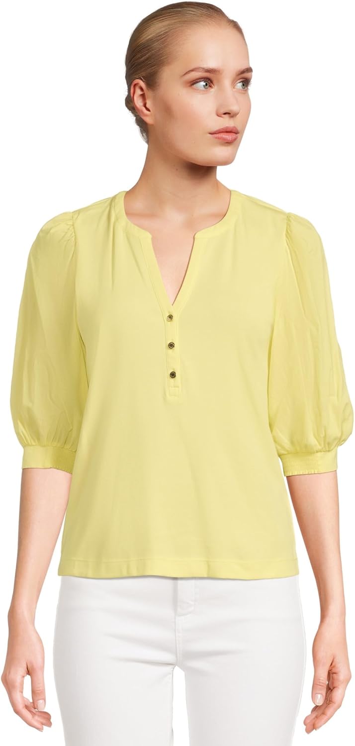 24" Straight fit top with woven puff elbow length sleeves, smocked cuffs, branded buttons on front placket and crew notched neckline.
