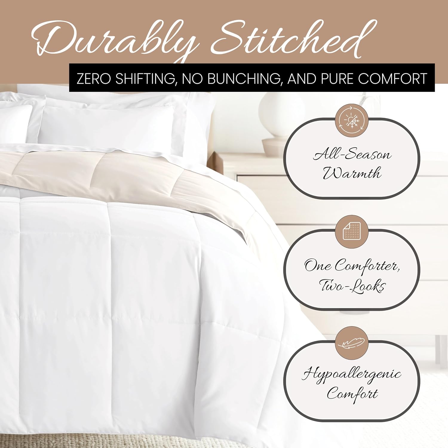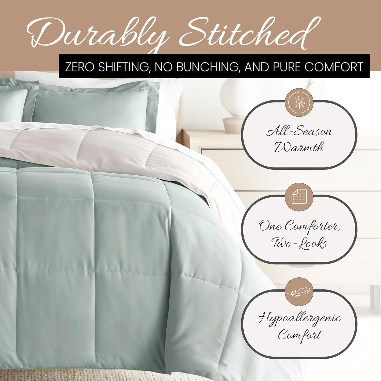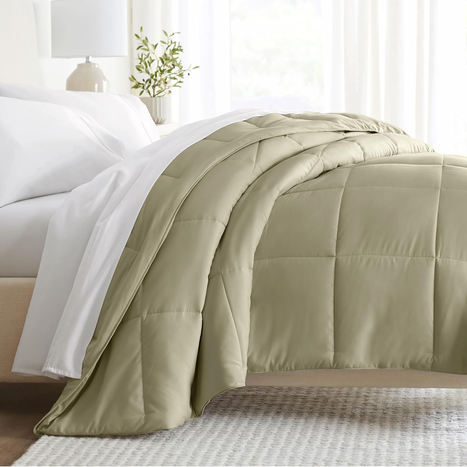The perfect comforter to keep you cozy all year round. The all-season down-alternative comforter features the perfect loft and down-like feel to keep you warm and toasty while you sleep. Designed for healthy living, this luxury comforter presents a quality alternative to down with incredible loft and end to end baffle-box construction, preventing fiber from shifting, eliminating the need for regular fluffing. Size guide: twin/twin extra long size includes:. 1 twin/twin extra long comforter: 70 inch x 90"full/queen size includes:. 1 full/queen comforter: 92 inch x 92"king/California king size includes:. 1 king/California king comforter: 108 inch x 94 inch