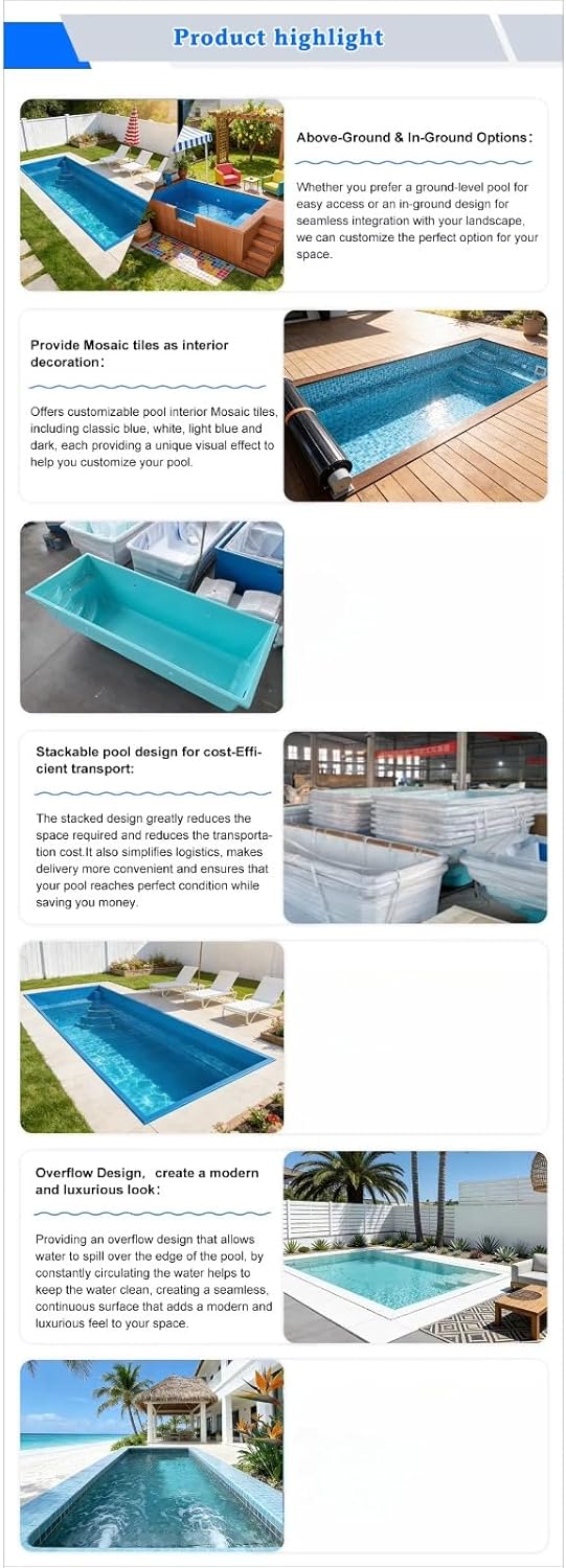 Thickness:8mm Applicable People:Children, Adult, All Type:pool Feature:customization Shape:customization Accessories:Pool Color:Customized Color Usage:Family Swimming Pool Product Paramenters Type Outdoor above-ground swimming pool Size 12.8 x 7.2 x 3.9 (ft) 17.1 x 7.2 x 4.6 (ft) 21.0 x 7.4 x 4.6 (ft) Customized Applications: Family ground rooftop swimming pool Upgrade your summer with our heavy-duty inflatable swimming pool. Built with multi-layer thickened it is wear-resistant, anti-leak, and built to last. The generous size allows multiple people to enjoy water activities together, promoting family bonding and outdoor entertainment. Easy to assemble , it brings convenience and joy to your home all season long.