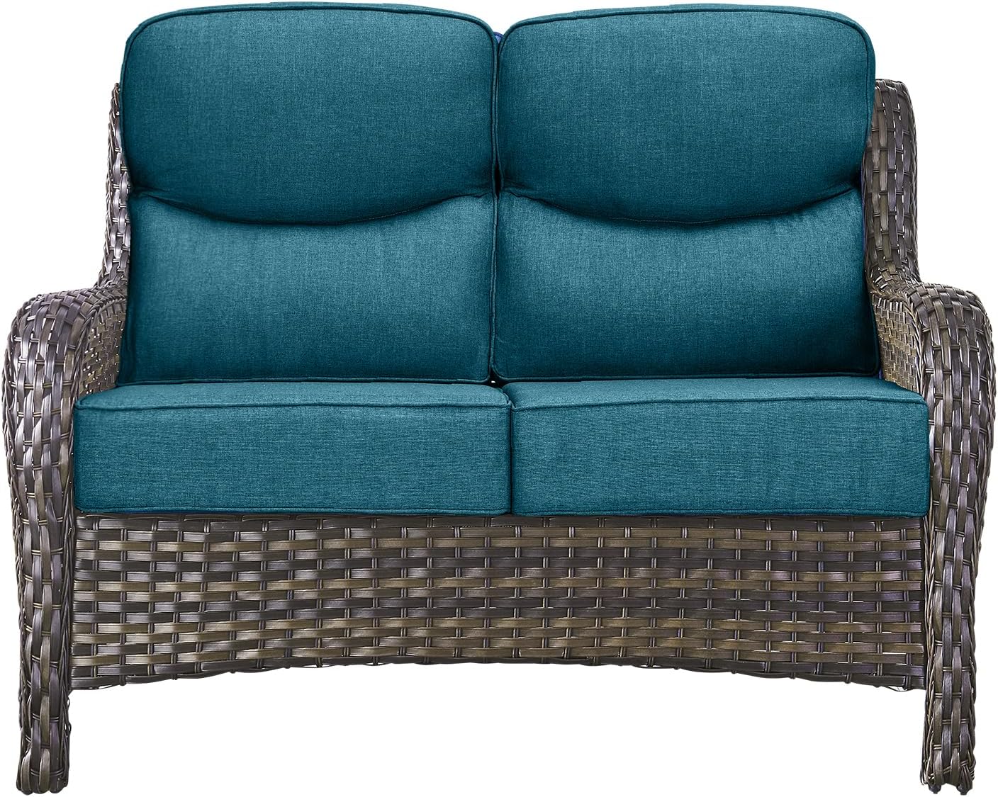 Luxury Patio 2-Seater Sofa Outdoor Loveseat with 6-Inch Smile Cushions - High Back Heavy Duty Comfortable Brown Wicker Rattan Furniture for Porch Balcony Deck Poolside Garden - Navy Blue