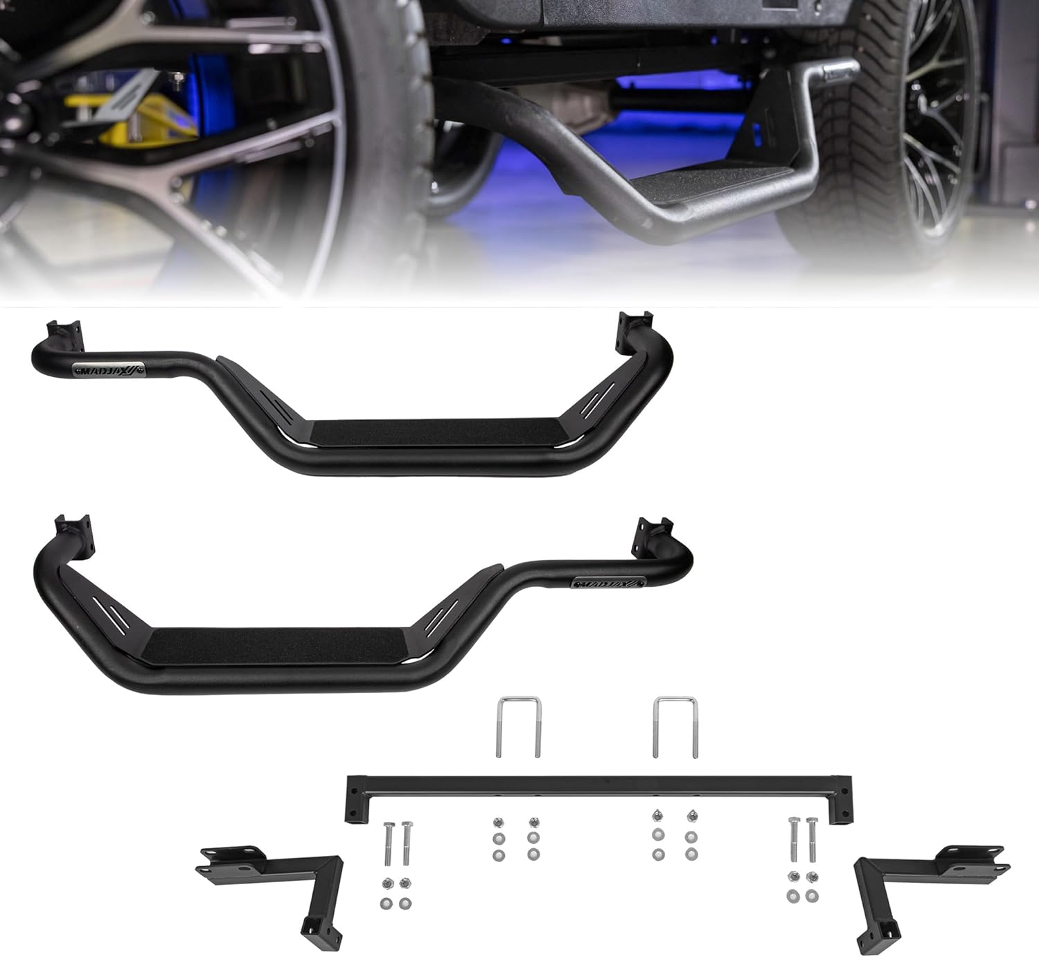 MadJax is the premier brand for aftermarket golf cart accessories, focused on providing innovative, bold and superior-quality products to the golf car industry. Our MadJax Recon Nerf Bars are designed to make getting in and out of your golf cart even easier. They feature a unique, drop-down design and are built with a matte texture to help minimize scrathes and dirt build-up for long-lastering performance - they also look great too. Each kit ships complete with model specific mounting hardware compatible with Club Car Precedent, Onward, and Tempo golf cart models - making installation a breeze.Each kit conatins a model-specific mounting kit and driver and passenger-side side steps.