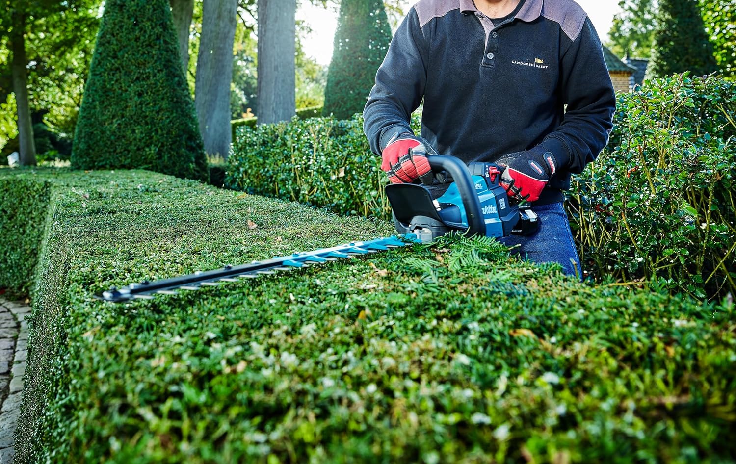 Cordless hedge trimmer 18 V / 75 cm; new blade tooth shape guides branches better; less friction of the blades: this increases the running time thanks to the low resistance and protects the material; handle with 5 positions: locks at 0° and 45° and 90° left and right for comfortable working in any posture; handle with 5 positions; well balanced by the placement of the battery. The rear end of the grip end Powerful and effective like a petrol device; power-saving work thanks to low weight; high stroke number for quick cuts; with electronically adjustable stroke number in 3 levels; brushless motor for more endurance, longer service life and more compact design; with constant electronics; technical data: idle stroke rate level 1 - 0 - 2,000 min-1; idle. Hohubpepepepe0 - 3,600 min-1; idle stroke speed level 3 - 0 - 4,400 min-1; cutting length - 75 cm; max. Branch thickness - 23.5 mm; battery voltage - 18 V; dimensions (L x W x H) mm - 1.261 x 192 x 225; weight - including BL1860B: 4.3 kg.