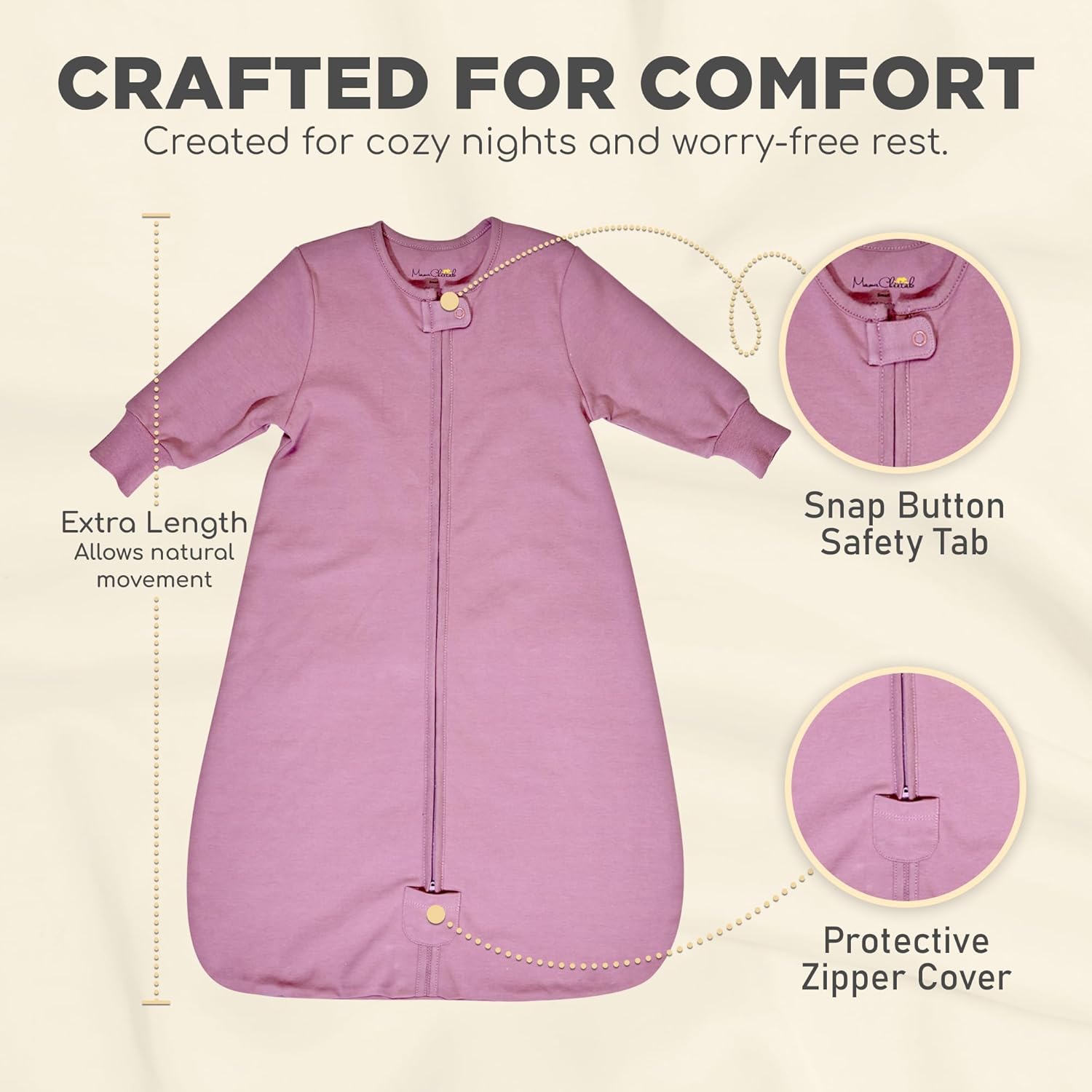 REST EASY KNOWING THAT YOUR BABY SLEEPS SAFELY AND SECURELY No more worries about loose blankets in the crib that can get twisted and tangled easily, and pose the risk of covering baby’s face. Our wearable blankets were carefully designed to provide a safe and comfortable sleeping environment for baby, while preventing such potential safety hazards in in your child’s sleep space. CAREFULLY DESIGNED TO PROMOTE BETTER SLEEP Our sleeveless sleep sacks, which have been designed to mimic the mother’s womb, keep babies cozy and warm, ensuring they sleep soundly throughout the night. Generously sized and roomy sleepbag design provides enough kicking room so baby's leg can move freely to ensure proper hip development. SOFT, LIGHT AND BREATHABLE The Mama Cheetah Wearable Blankets are made of baby-safe, light and breathable, 100% premium organic cotton to keep your child warm, cozy, and sleeping peacefully. The light and breathable cotton interlock fabric minimizes the risk of overheating and keeps your baby comfortable. TWO-WAY ZIPPER FOR EASY DIAPER CHANGES No struggling with those midnight diaper changes! Our sleeping sacks feature high quality and durable 2-way zippers, which unzip from the bottom for easy diaper changes. Also, no struggling to connect the zipper at baby's chin in the middle of the night! 2-way zipper unzips from the top and makes it very easy to use.