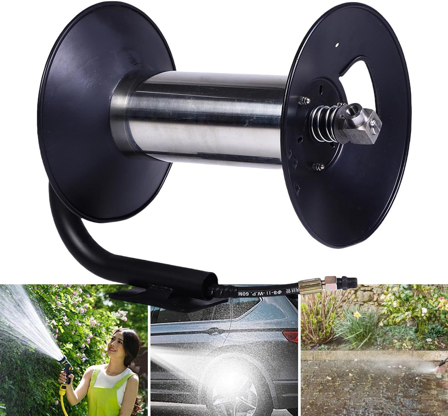 Spec: Item Type: High Pressure Washer Hose Reel Material: Alloy Steel Maximum Capacity: Approx. 50m / 164ft Package List: 1 x Hose Reel 1 x Handle 6 x Screws 6 x Nuts 1 x Fixing Strip 3 x Connectors 1 x Waterproofing Tape How To Use: Open the packaging and remove the hose reel to begin using. Note: The hose reel does not include a 164ft hose.