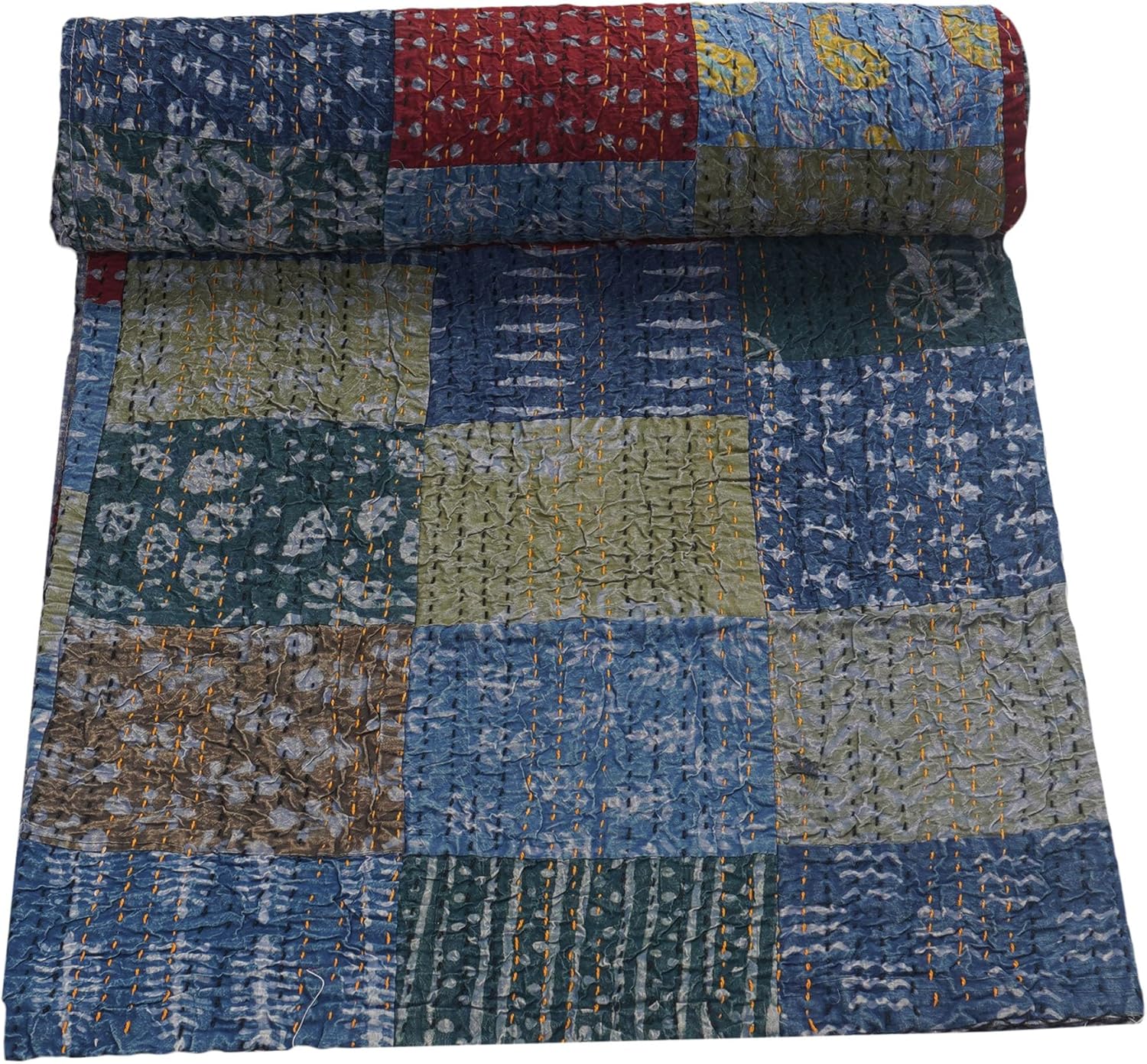 Made with 100% cotton and natural vegetable colors. This piece is of art is completely hand stitched by Women artisan in Rajasthan, India. A beautiful creation to give your home a traditional yet authentic colorful look with this beautiful kantha quilt blanket or throw which can also be used as handmade tropical Kantha bedspread bedding. This piece is of art is completely hand stitched by Women artisan in Rajasthan, India. The entire quilt is hand embroidered with end number of straight running stitches to create a unique product, one of it's kind.These quilts are famed and admired due to their Kantha work. They have different beautiful warm and charming colors, designs and patterns on either side which gives a distinct look. These cotton lightweight "Quilts" can be used as Bedspread , Bedding Throw , Blanket Or Quilt, A Summer Bed Cover, A Fabulous Picnic Rug, Nice Bedroom Quilt This can fit to a King size bed as blanket or throw or can easily fit as bedspread / bed cover to King bed . Washing Instruction – Easy To Hand Wash & Dry Clean.