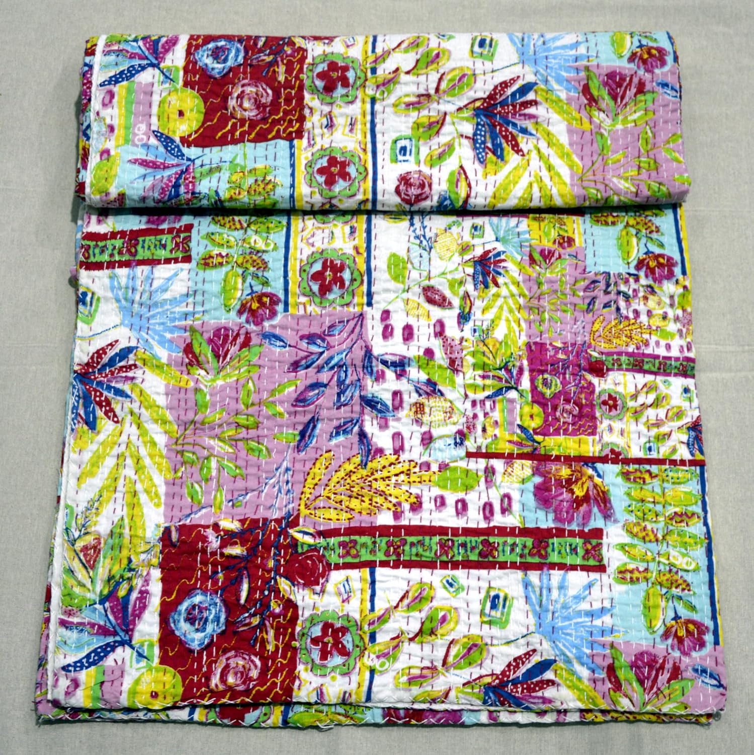 Made with 100% cotton and natural vegetable colors. This piece is of art is completely hand stitched by Women artisan in Rajasthan, India. A beautiful creation to give your home a traditional yet authentic colorful look with this beautiful kantha quilt blanket or throw which can also be used as handmade tropical Kantha bedspread bedding. This piece is of art is completely hand stitched by Women artisan in Rajasthan, India. The entire quilt is hand embroidered with end number of straight running stitches to create a unique product, one of it's kind.These quilts are famed and admired due to their Kantha work. They have different beautiful warm and charming colors, designs and patterns on either side which gives a distinct look. These cotton lightweight "Quilts" can be used as Bedspread , Bedding Throw , Blanket Or Quilt, A Summer Bed Cover, A Fabulous Picnic Rug, Nice Bedroom Quilt This can fit to a King size bed as blanket or throw or can easily fit as bedspread / bed cover to King bed . Washing Instruction – Easy To Hand Wash & Dry Clean.