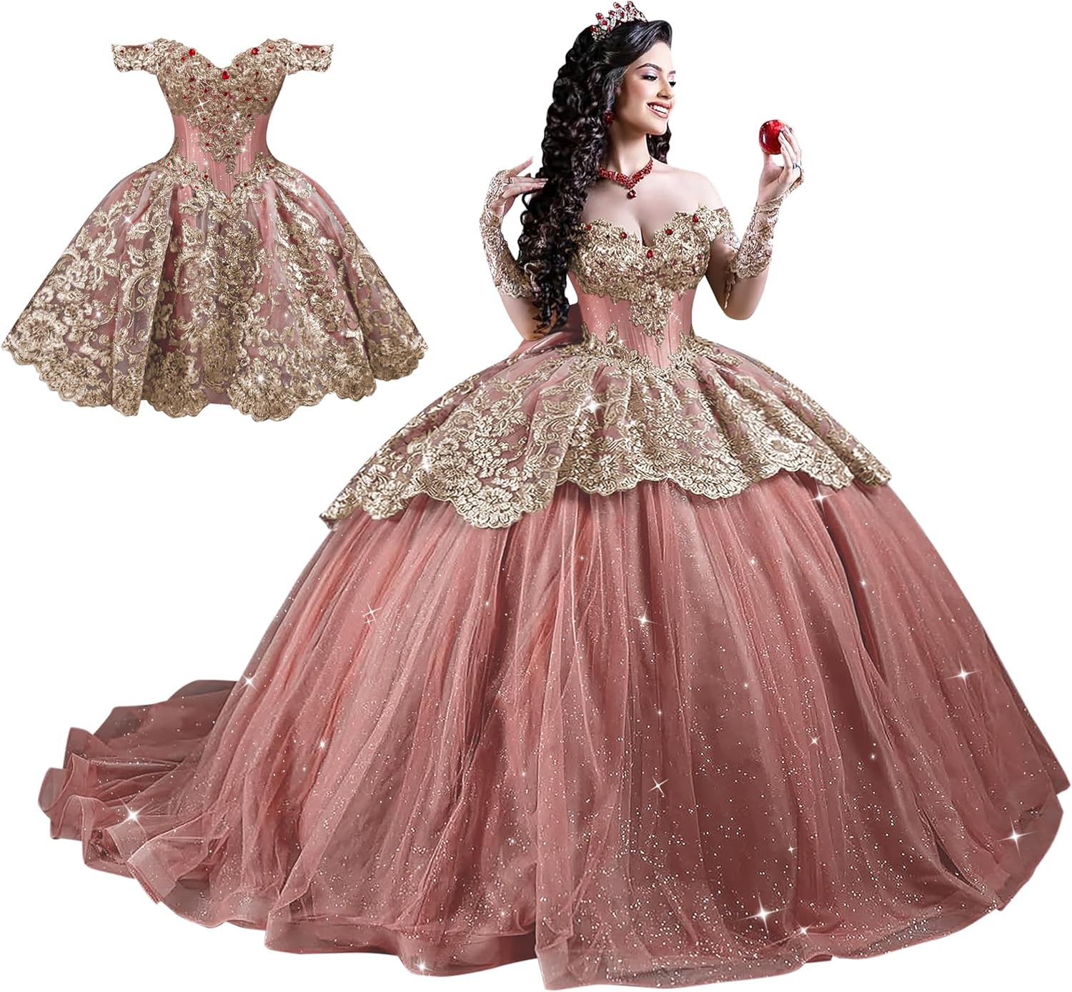• Design: 2 in 1 Quince Dresses with layered train ,Gold lace Appliques,Layered,Beaded, glitter tulle ,Off Shoulder ;big puffy dress,corset ,with Bow, lace up closure,it is easier for us adjust the size. Kindly noted: The model in the picture wears underskirt. If you want to achieve the same look as the picture, you can wear a underskirt too.