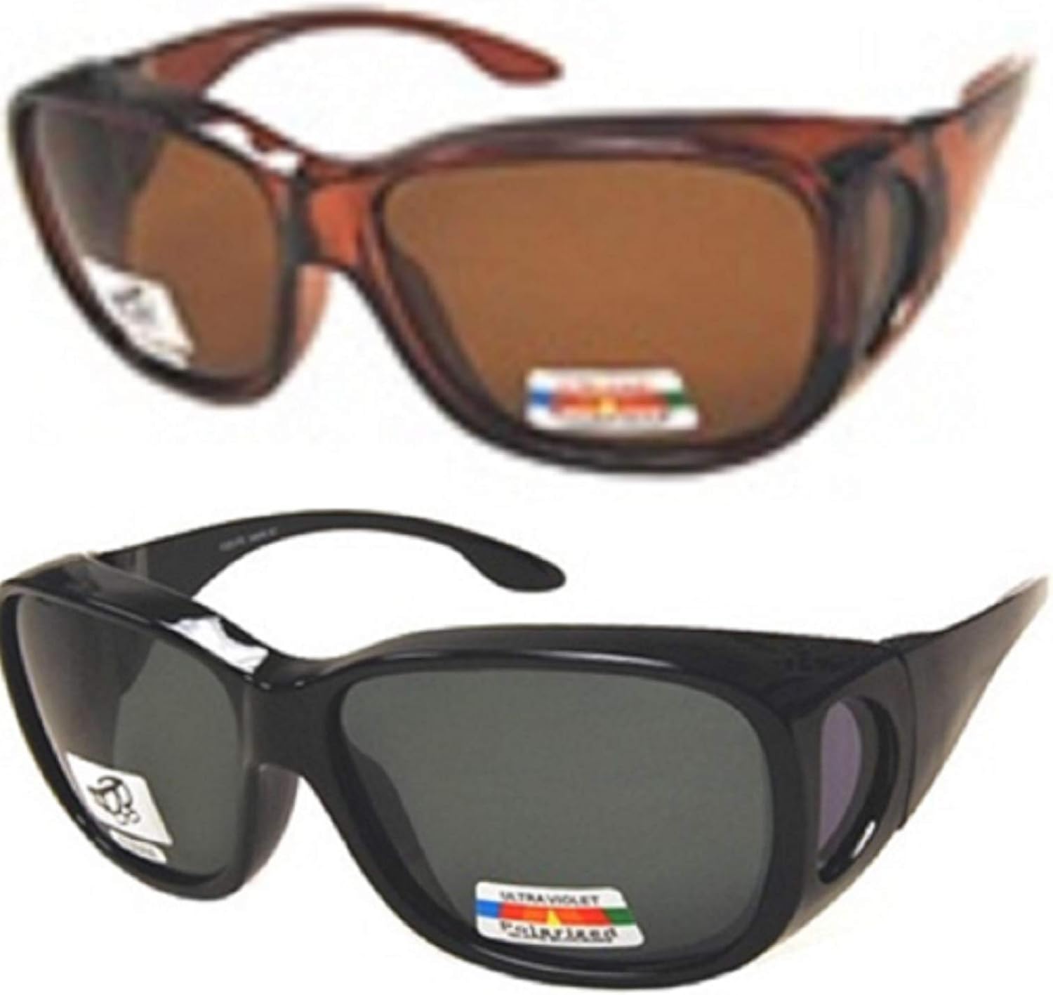 Fit Over Cover Over sunglasses are perfect for men and women who want the benefit of sun protection while wearing their eyeglasses. They're lightweight with an anti-glare lens and easy to slip on over your all kinds of eyewear. These glasses are designed to wrap around your face blocking the sun from the sides. All sizes are polarized which will increase clarity, reduce eye fatigue, and glare protection while golfing, driving, fishing and all water sports and outdoor activities. Available in Black, Brown, and Tortoise. Size Large. One Microfiber cleaning carrying case included per pair of sunglasses.