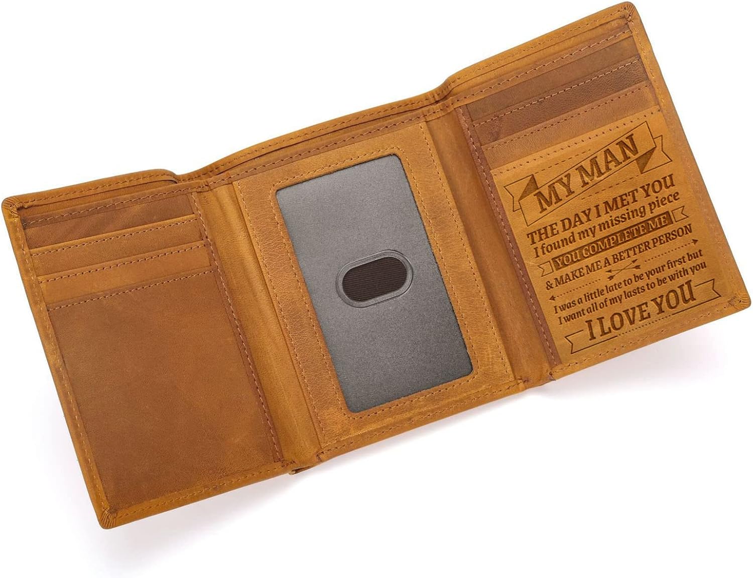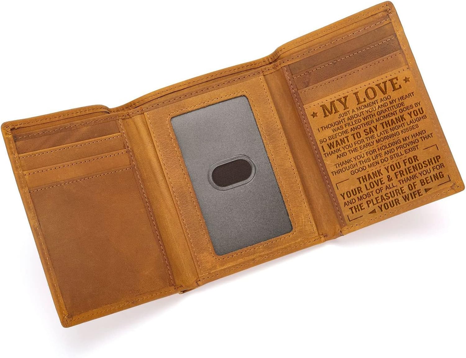 Husband Wallet Engraved Leather Men Wallet to My Husband Personalized Tri-fold Wallet, Birthday Anniversary Christmas Valentine Gift From Wife. The size is 4.5" length x 3.7" wide, with 8 card slots, 1 clear slot, and 1 cash pocket
