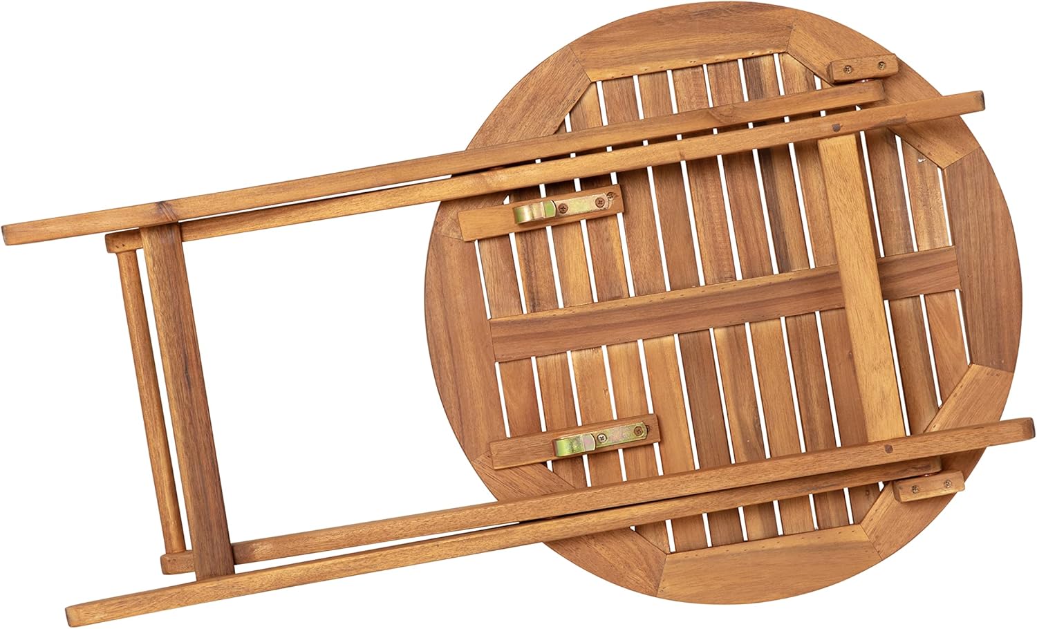 Create a relaxing space to chat with friends or unwind poolside with this three piece folding bistro set. Durable acacia wood construction is naturally weather resistant and this set features a teak oil layer for added protection. Lightweight and easy to fold, store your set when not in use or easily move around when needed. The spacious tabletop is perfect for snack and drinks while two chairs offer comfortable slatted backrests and a reliable 300 lbs. static weight capacity. Easy to assemble and clean, this three piece bistro set is the perfect choice for all your home seating needs.