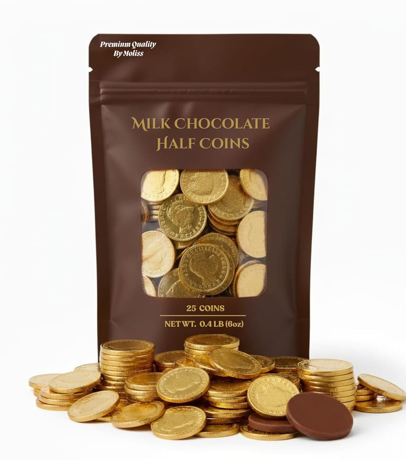 These gold chocolate coins Each piece is individually foil-wrapped, helping keep chocolates separated and convenient for sharing. approximately 1.5 inches in diameter. Enjoy milk chocolate coin-shaped candies with a half-dollar style design. Ideal for candy bowls, party favors, classroom treats, pinatas, seasonal celebrations and St. Patrick's Day
