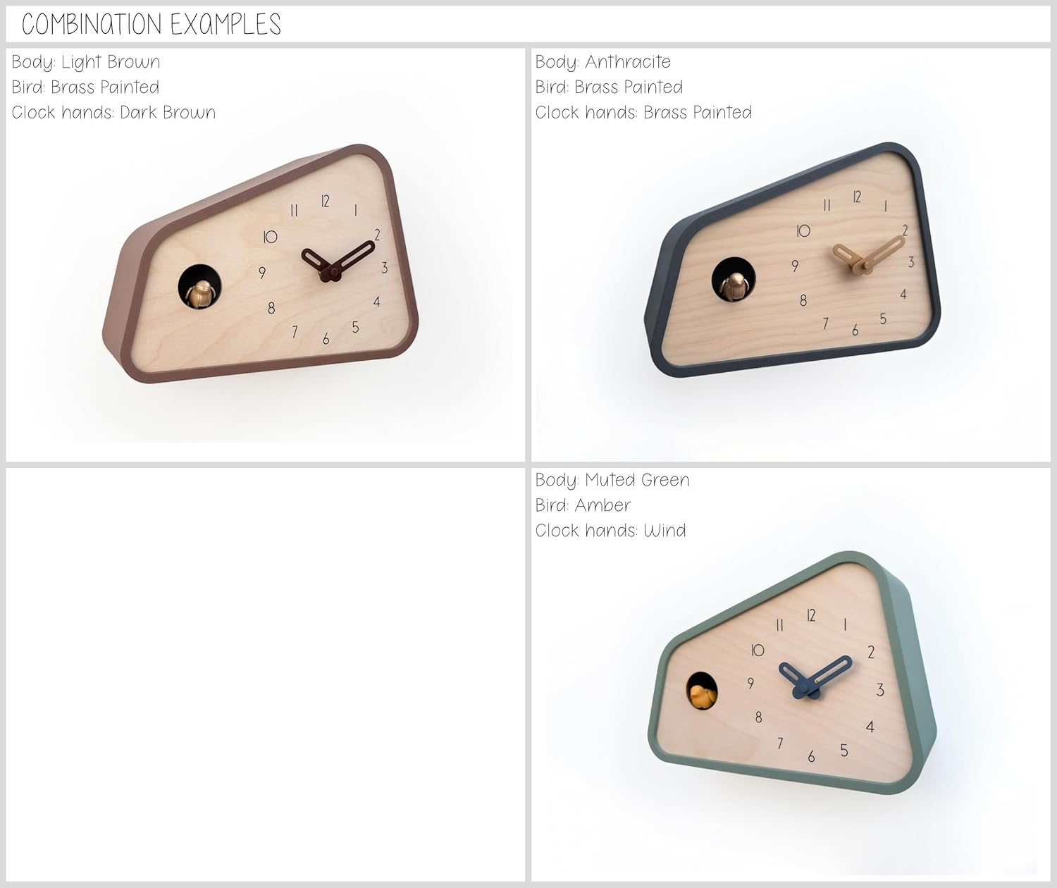 • Each cuckoo clock is handcrafted and made to order in the color of your choice. Handling time for this clock is 5 days. The box is made of wooden birch plywood and highly recyclable plastic. Plastic housing is not painted, it is the original color of plastic. Wooden parts are not varnished. Clock hands are made of recyclable plastic, painted and varnished with water-based painting and varnish. As wood is a natural material, the texture of the wood can differ from the clock in the pictures.