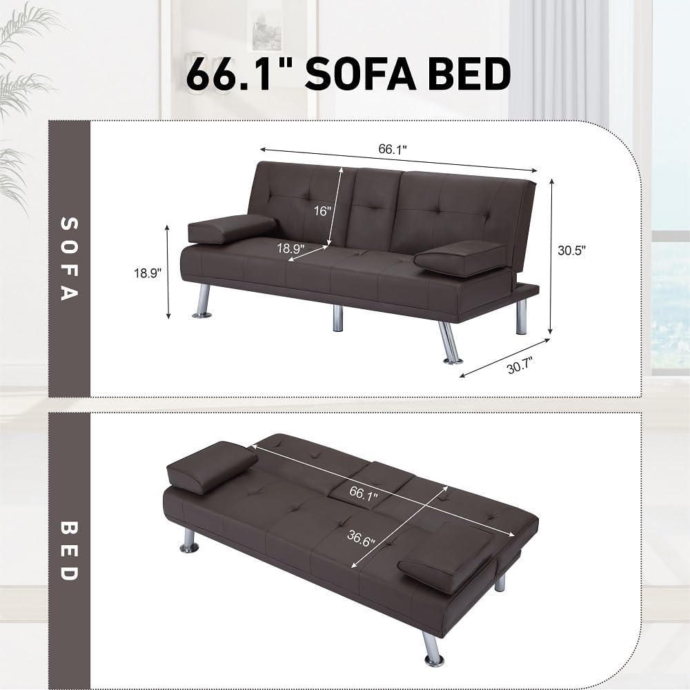 - 66.1” Futon sleeper sofa bed, a drop down middle back with 2 cup holders,