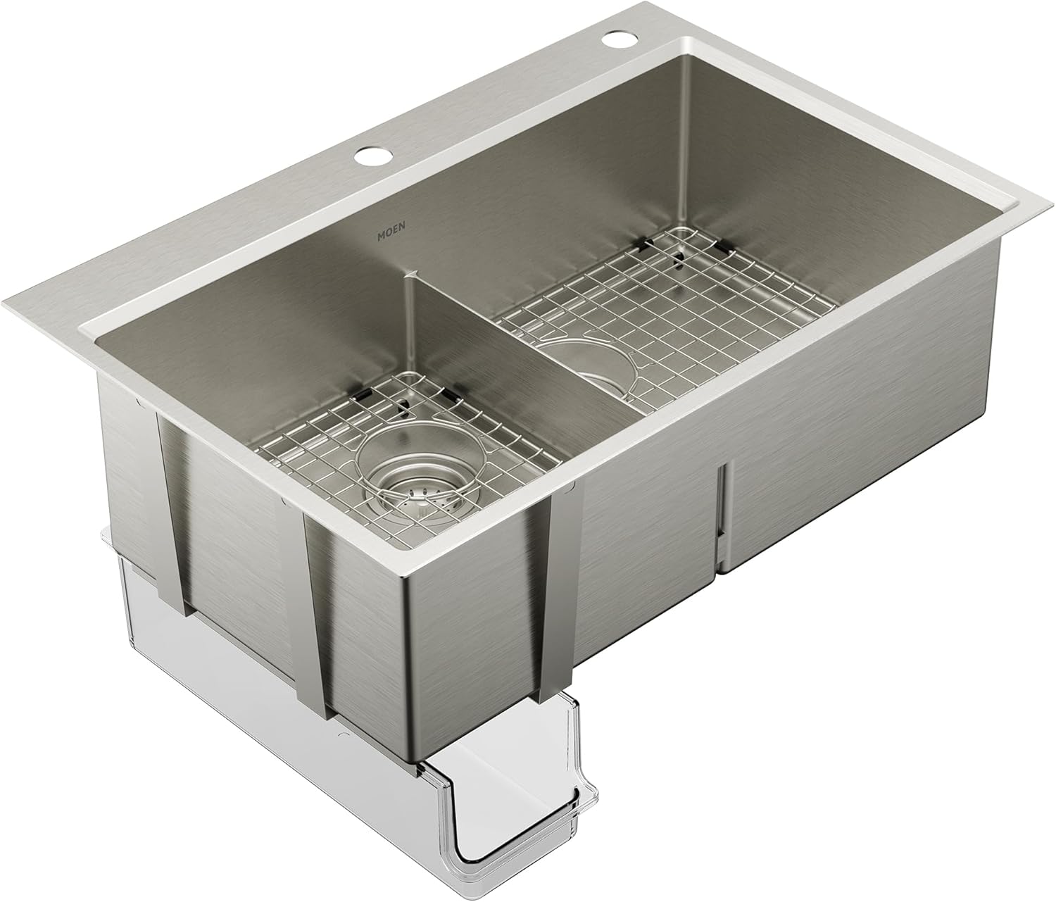 Moen Luxe Chef Workstation System Sinks have been thoughtfully designed to streamline your productivity and are the go-to resources to handle any cooking needs. The versatile system allows you to select from two different dual mount sinks and choose from a variety of accessories to fit how you move about your kitchen; the sink features a sliding ledge to keep accessories secure and extend your prep space over the sink while keeping it tidy. These accessories include a stainless steel bottom sink grid, basket strainer/drain assembly, bamboo cutting board, drying racks, clear plastic prep bins, colander and utensil bin. This space-saving design also features an exclusive open trough bin allowing quick access to your sink accessories. Made from durable 16-gauge heavy-duty stainless steel, these sinks are built to withstand even the most demanding chores and the heaviest pots and pans that come with experimenting with new recipes.