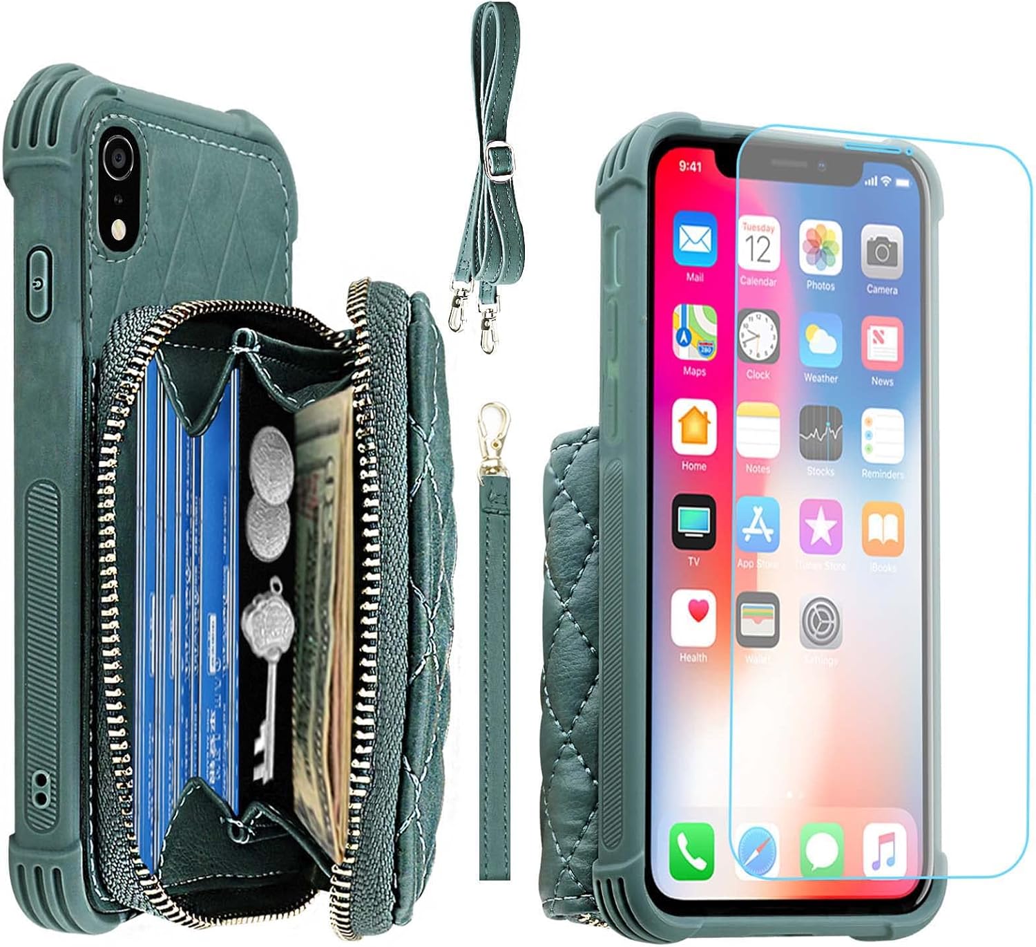 Product Description: The MONASAY crossbody zipper wallet case for Apple iPhone XR is made of premium quality leather and full-body bump-resistant materials, with precise cutouts that fit your phone perfectly and provide a thoughtful protection for your iPhone. Let you have fun while shopping, walking the dog, biking, outdoor activities. Features: The beautiful rhombus -shaped look expresses individuality, style and elegance. Handbag with lanyard wrist strap, detachable and adjustable length for hands free. RFID blocking purse case for cash,keys, coins , cards. Anti-collision and anti-drop design provides full body protection. A stand for watching movies and reading, video chatting. Precise cutouts for all ports make use easier and faster. Package Includes: 1x Leather phone cover for iPhone XR. 1x Screen Protector for iPhone XR. 1x Unique packaging box. Note: Compatible with iPhone XR, not Fit for any other phone models. Reliable Worry-free service: 60-Day money back and 365-Day friendly customer service.