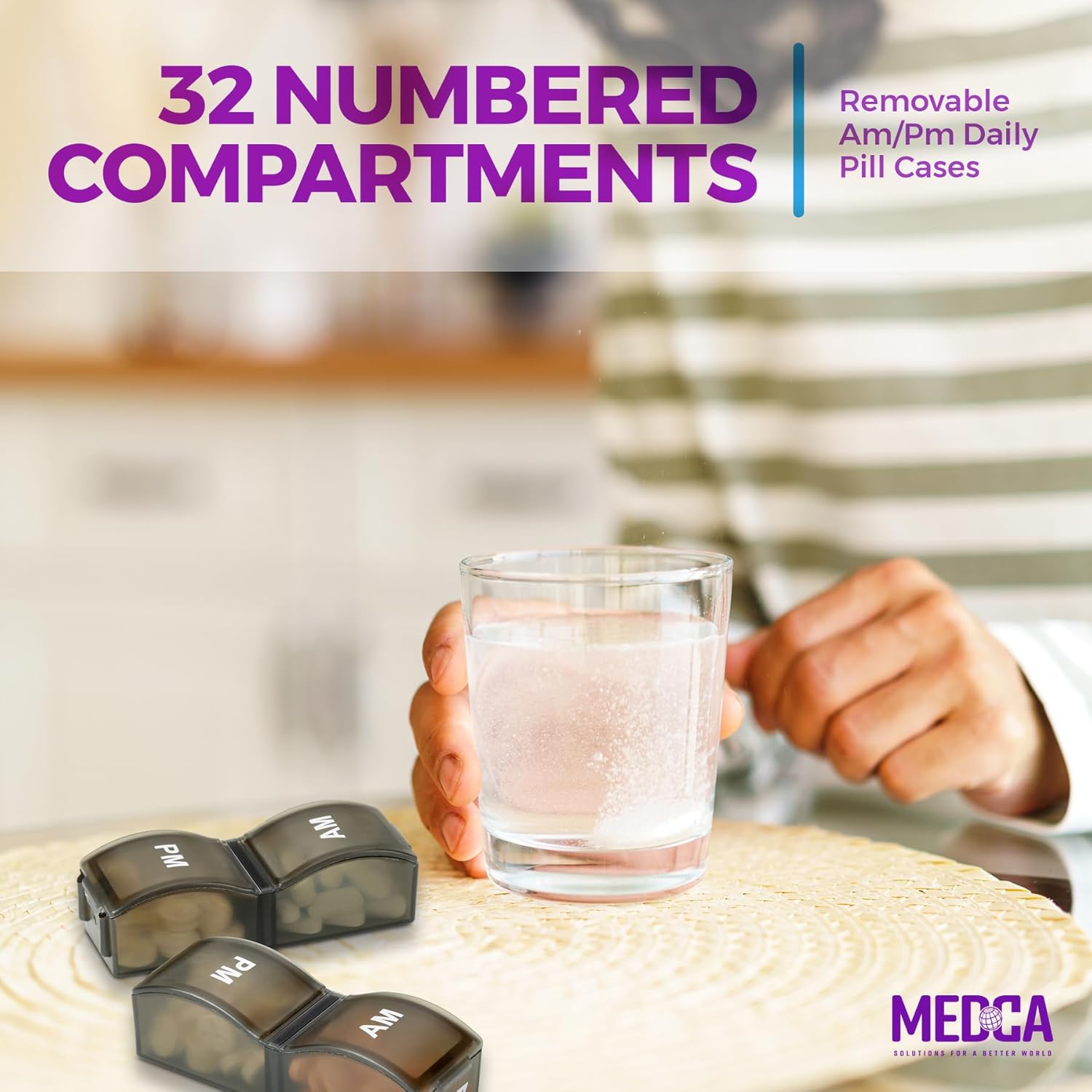 Do you have a hard time keeping track of all your daily medications? Have you been searching for a new way to help you remember your morning and evening meds? Then your search is over! The MEDca 31 day pill organizer features bright and colorful see through compartments you will be able to check to see if you have taken your pills for the day and you won't have to keep multiple pill boxes. BEAUTIFULLY COLORED COMPARTMENTS MARKED CLEARLY FOR YOUR CONVENIENCE Secure and Compact Compartments that a ideal for individuals with memory loss, elderly senior people, those under multiple medications, or haven't been taking their perscribed medications. PILL DISPENSER FEATURES: - 32 Numbered Compartments - Bright Translucent Colors - Removable Am/Pm Daily Pill Cases - BPA Free, Safe & Non-Toxic Food Grade PP - Travel Friendly - Durable Quality Construction - Ideal home health care living aid for the elderly, seniors and all ages. When looking for new health management solutions it can be difficult to find products that are trustworthy, safe, and effective. MEDca offers only premium quality home health aids. Why Wait!? ADD TO CART to order your 30 day pill organizer today!