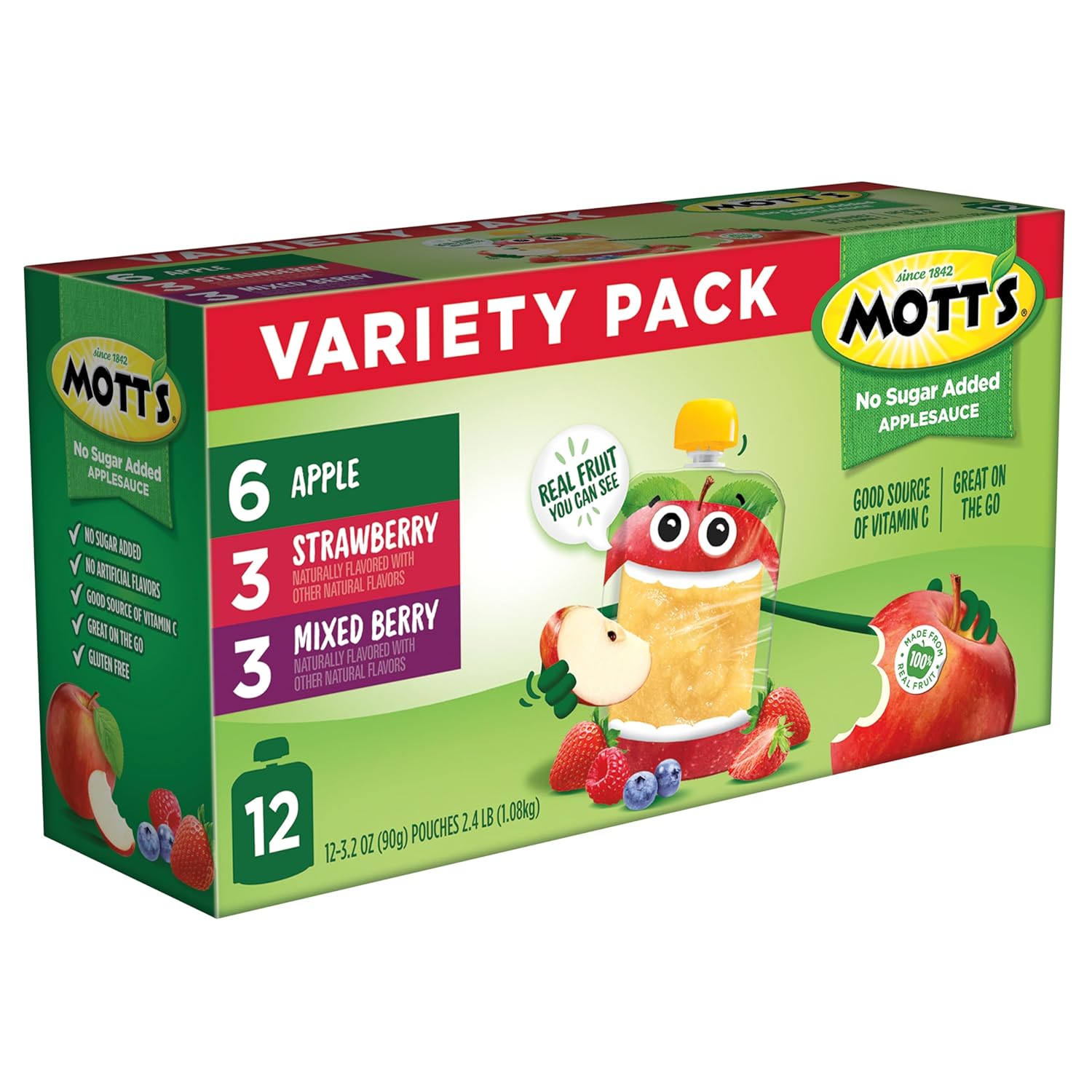 The original, delicious treat, Mott's No Sugar Added Applesauce Variety Pack is the perfect snack or meal companion. Available in 12- or 20-packs, Mott's Applesauce comes in refreshing flavors like our appetizing Apple, sweet Strawberry, and tart Mixed Berry so you'll be sure to find something that satisfies your taste buds. Made with 100% real fruit and no artificial flavors, you can feel good about making healthy choices. A good source of Vitamin C and free of cholesterol, Mott's No Sugar Added Applesauce Variety Pack brings the best of the orchard to your household to help families enjoy delicious fruit goodness every day. Mott's has a strong heritage and has been the trusted apple juice and sauce brand since 1842. Dedicated to giving parents easy ways to help their families be their very best, Mott's holds the apples to a very high standard. That's why we pack lots of delicious fruit flavor from ripe apples into every serving. So, whether you're home with your family or on the go and in need of a snack, Mott's has a delicious flavor to enjoy. With an extensive suite of flavors, Mott's No Sugar Added Applesauce Variety Pack gives you flavorful choices for all your snacking needs!