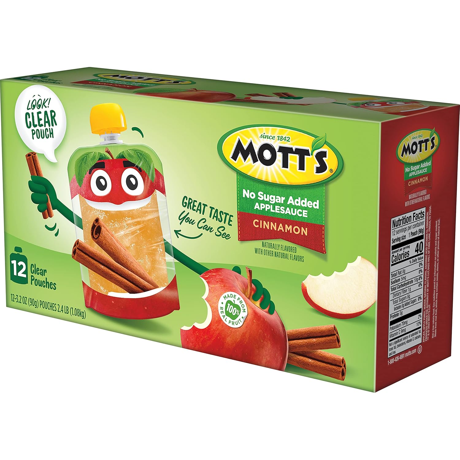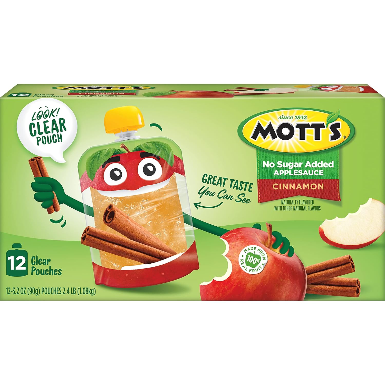 The original, delicious treat, Mott's No Sugar Added Cinnamon Applesauce Pouches are the perfect snack or meal companion. It's a good source of Vitamin C and free of cholesterol. Bringing the best of the orchard to your household, Mott's helps families enjoy delicious fruit goodness every day. The apple juice and sauce brand is dedicated to giving moms easy ways to help their families be their very best. Mott's has a strong heritage and has been the trusted apple juice and sauce brand since 1842. Mott's hold the apples to a very high standard, that's why the products pack lots of delicious fruit flavor from ripe apples into every serving. Enjoy Mott's in a variety of pack types including pouches, cups, jugs, juice boxes and jars; so whether you're home with your family or on-the-go and in need of a snack, Mott's has a product for you. You won't find any artificial flavors in Mott's products, so you can feel good about making healthy choices.
