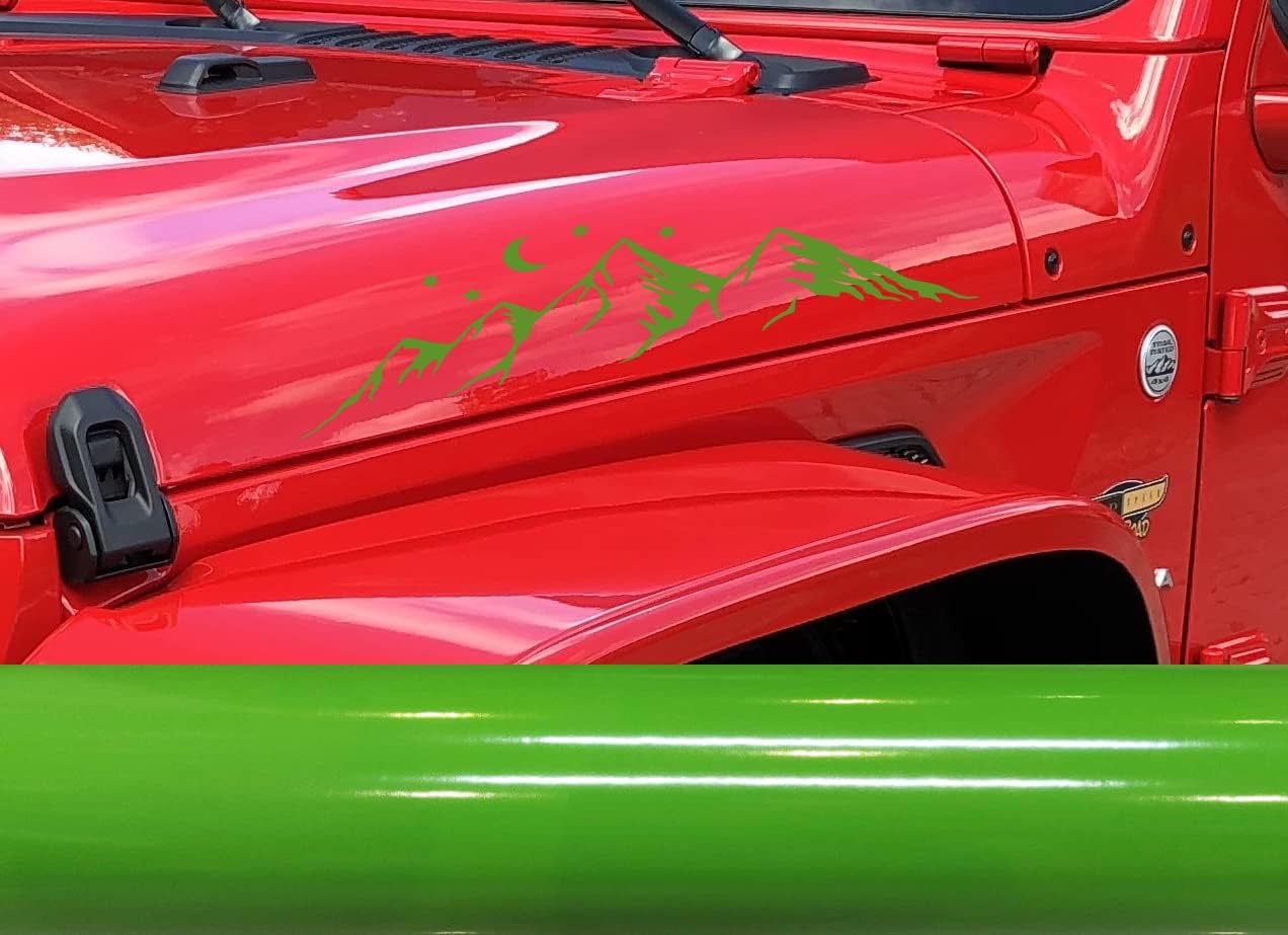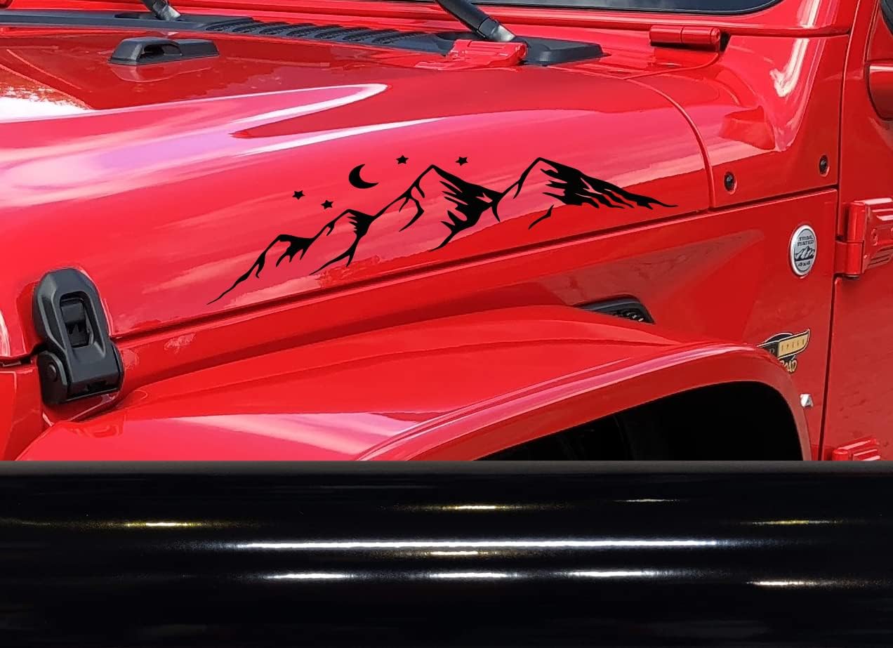 Mountains Range Theme Decal Sticker for Jeep Hood Fender Sides 23 X 5 Inches Set of 2 Mirrored Decals. fit Jeep, Auto, Cars, Trucks Can be placed in any Jeep Truck or any flat surface Drastically change the look of your Vehicle USA Made with 651 top in the industry 6 to 7 years indoor outdoor. Note: We Are not responsible for Installation errors. Installation is the sole responsibility of the purchaser and is done at his or her own risk.