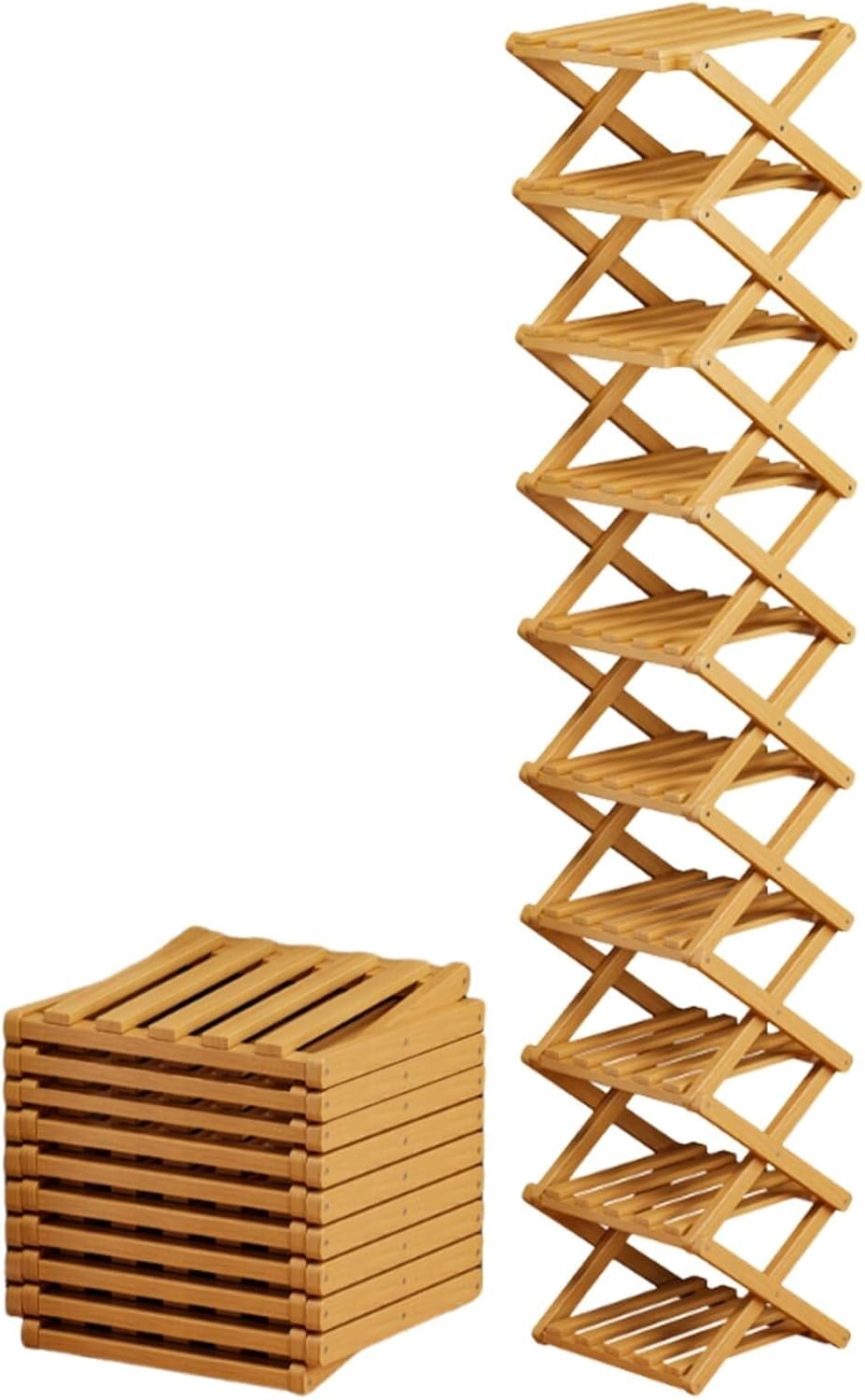Its unique wooden folding structure provides sturdy support during daily use, yet folds away effortlessly when not needed—remaining lightweight and compact, taking up virtually no space.This multifunctional rack combines storage and display capabilities, making it an ideal solution for organizing footwear in entryways, closets, hallways, garages, utility rooms, bathrooms, or living areas.Its versatile design allows it to blend seamlessly into various living environments—from apartments to dormitories—offering exceptional practicality without compromising on aesthetic appeal.Product SpecificationsMaterial: Wood9-Tier Unfolded Dimensions: Approx. 26 x 26 x 73 cm / 10.24 x 10.24 x 28.74 inches10-Tier Unfolded Dimensions: Approx. 26 x 26 x 159 cm / 10.24 x 10.24 x 62.6 inches9-Tier Folded Dimensions: Approx. 31 x 26.9 x 21 cm / 12.2 x 10.59 x 8.27 inches10-Tier Folded Dimensions: Approx. 31 x 26.9 x 23.5 cm / 12.2 x 10.59 x 9.25 inchesPackage Contents:1 x Wooden Shoe RackImportant Notes:1. Product dimensions are measured manually; please allow for slight discrepancies.2. Display colors may vary depending on your monitor settings; the images provided are for reference only. Please refer to the actual product for the true color.3. If you have any questions regarding the product or your order, please contact us via the Amazon platform. We will respond to your inquiry within 24 hours.