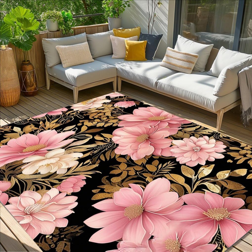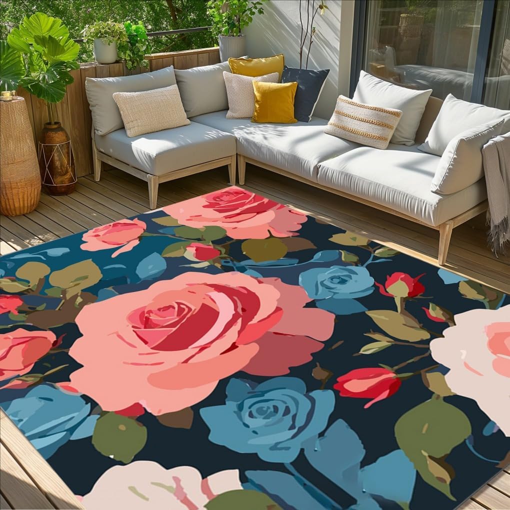 Elevate your home decor with our exquisite floral pattern outdoor area rugs, featuring vibrant designs—from pink roses to bold multicolored blooms—that blend artistry and style. These rugs offer comfort underfoot, and easy maintenance, great for outdoor entertaining, this rug infuses patios, decks, or gardens with natural elegance. complementing bohemian, modern themes decor. It offers comfort while maintaining its vivid floral patterns. Available in multiple sizes, it adapts to any layout.