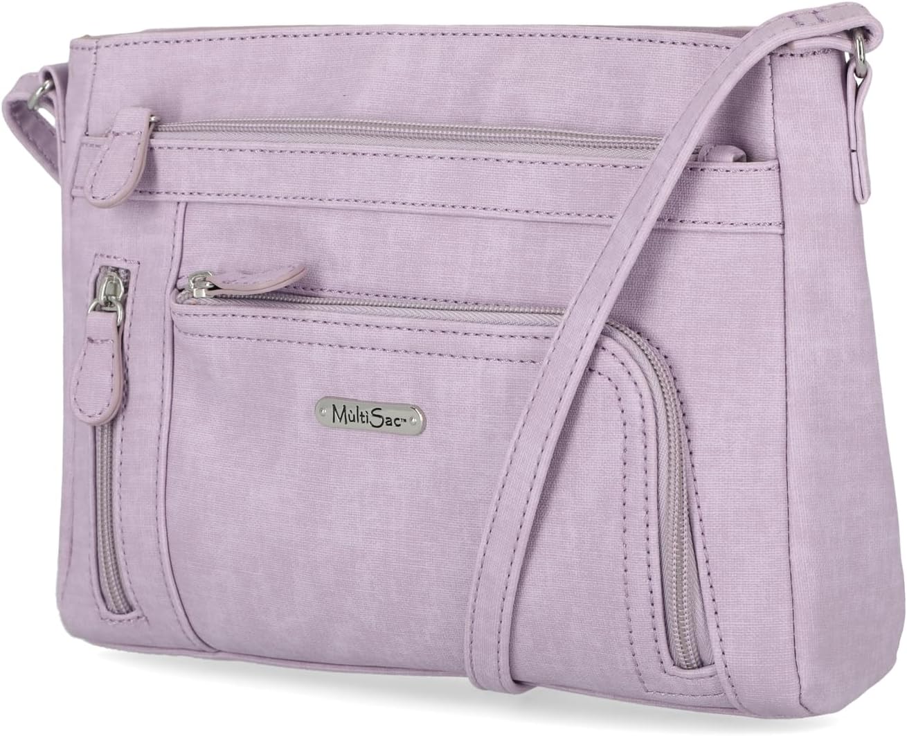 The summerville east west crossbody is stylishly designed with top zip main pocket uniquely designed front face has a zipper pocket a half zip around pocket on right side, left side with vertical zipper Pkt. On the back outside There is a specially designed slit pocket for your cell phone. Inside features include 2 drop in pockets, a back wall zip pocket-10"l x 7 1/2" H x 1 1/2" D - 26" Adjustable strap.