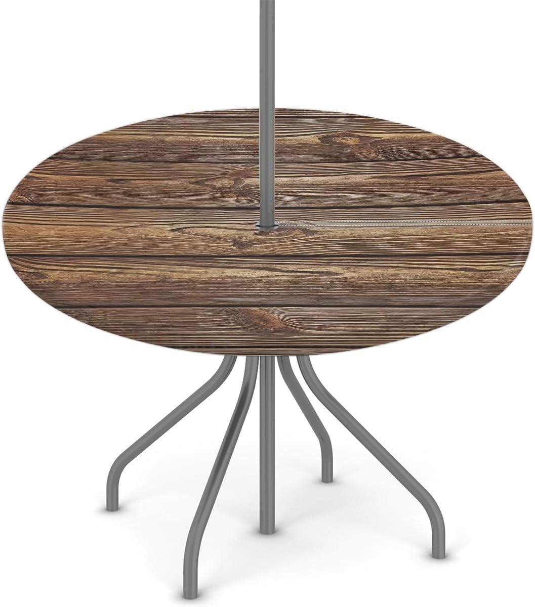 Outdoor Tablecloth With Umbrella Hole, Blue Wooden Round Fitted Tablecloth With Elastic 36"-44" Waterproof Oil-Proof Round Outdoor Tablecloth Patio Table Cover for Picnic Camping Party