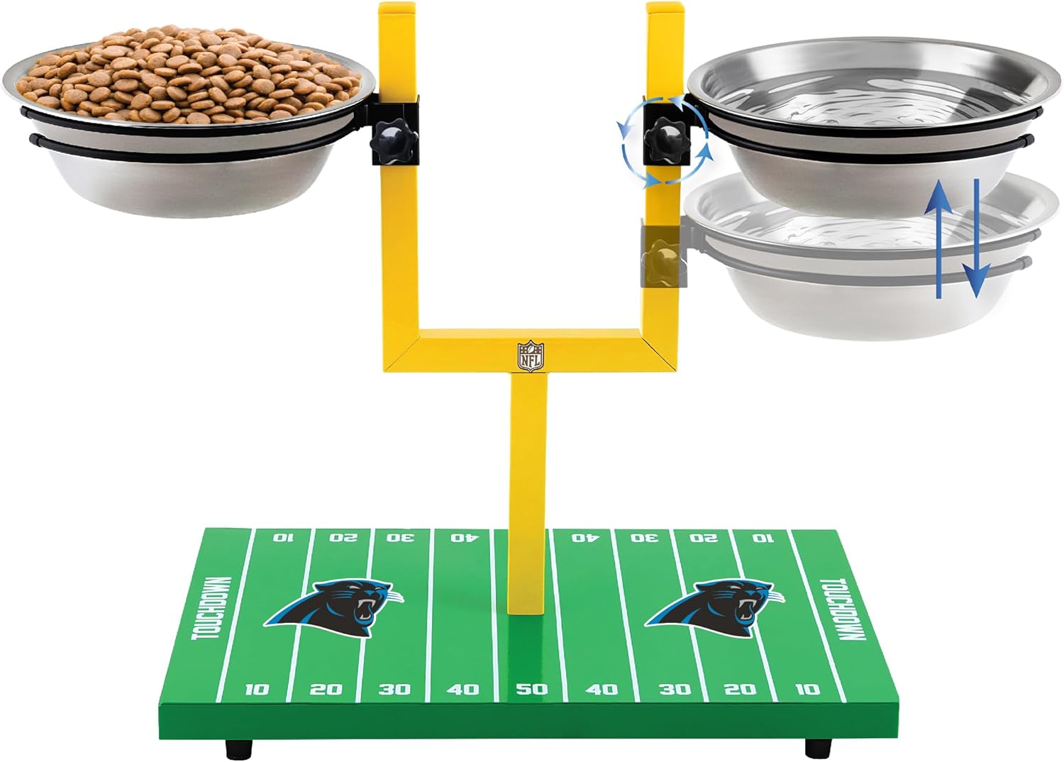 Give your furry friend a mealtime experience worthy of a champion with the NFL Goalpost Dog Feeder! Designed for both comfort and team spirit, this adjustable elevated feeder grows with your pet, offering multiple height settings to support different life stages. By raising your dog's food and water bowls, this feeder promotes better digestion, reduces strain on the neck and joints, and helps prevent gastric upset—making it an excellent choice for puppies, senior dogs, and those recovering from injuries. Built for durability and convenience, the feeder includes two removable stainless steel bowls, each with a 32 oz (4-cup) capacity, ensuring plenty of room for food and water. The high-quality stainless steel provides a sanitary eating surface, resists rust, and is dishwasher safe for effortless cleaning. Simply lift the bowls out for quick refilling or washing. Designed with stability in mind, the sturdy base features non-slip rubber feet to keep the feeder in place and prevent messy spills. Plus, it’s the ultimate game-day accessory—customize your feeder with the NFL team name and logo of your choice, so your pup can represent your favorite team while enjoying their meal. Whether you're a die-hard football fan or just want to give your dog a healthier way to eat, the NFL Goalpost Dog Feeder is the perfect addition to your pet's daily routine! This SUPER COOL and INNOVATIVE PET FEEDER TRAY TABLE comes in ALL NFL TEAMS: Arizona Cardinals, Atlanta Falcons, Baltimore Ravens, Buffalo Bills, Carolina Panthers, Chicago Bears, Cincinnati Bengals, Cleveland Browns, Dallas Cowboys, Denver Broncos, Detroit Lions, Green Bay Packers, Houston Texans, Indianapolis Colts, Jacksonville Jaguars, Kansas City Chiefs, Los Angeles Chargers, Los Angeles Rams, Miami Dolphins, Minnesota Vikings, New England Patriots, New Orleans Saints, New York Giants, New York Jets, LA Raiders, Philadelphia Eagles, Pittsburgh Steelers, San Francisco 49ers, Seattle Seahawks, Tampa Bay Buccaneers, Tennessee Titans and Washington Commanders Team. Pets First Overview: Pets First has established itself as the largest sports-licensed pet product company in the country. @ Pets First we provide every pet owner with premium licensed pet products. From unique & colorful apparel items to fun & playful accessories & toys. We follow the highest standards of safety guidelines to ensure your pet's security, while providing a long-lasting product. Working with the latest technology, our creative designers choose from the highest quality materials to provide durable, unique and innovative pet merchandise. PETS FIRST Licenses: Major League Baseball (MLB), Major League Baseball Players Association (MLBPA), National Football League (NFL), National Football League Players Association (NFLPA), National Basketball Association (NBA), National Hockey League (NHL), National Hockey League Players Association (NHLPA), JOHN DEERE, Realtree (RT), Real Madrid (RM), MLS Soccer, LAURDIY - For all Lauren Riihimaki's fans & followers. Over 50 of the top colleges in the country (NCAA) Football & Basketball. Pet owners want to be proud of the team gear their pet wears. That's what we had in mind when we designed our pet apparels, toys & accessories. Our NFL, NCAA, MLB, MLBPA, NBA, NHL, MLS, LaurDIY, John Deere and Realtree products are crafted with advanced technology and high-quality materials, with the team logo and wordmark approved by the sports league! Our Products: Pets First is known as the source for pet products. The depth of product offering from Pets First is unparalleled in the sports-licensed pet product industry. Pets first continually strives to build on its success & gain market share by developing and executing sought-after products that pet owners feel confident purchasing for their pets. When you are a pet owner YOU ARE PART OF THE PETS FIRST FAMILY!