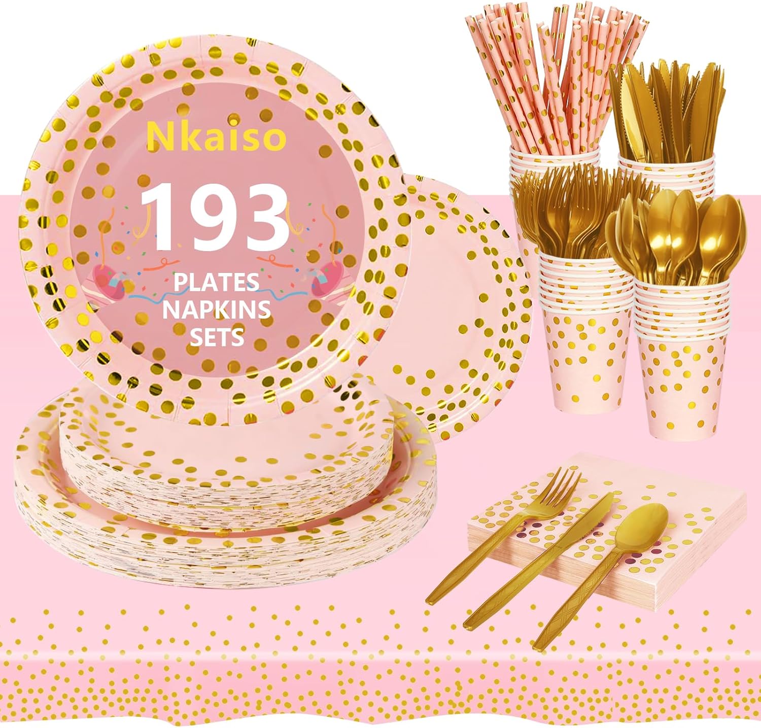 Nkaiso 193 Pcs paper party tableware set with unique rose gold design, suitable for theme party, birthday party, family party, outdoor camping and so on, spend a wonderful holiday with your family and friends! Specification: Material: paper Dessert plate: 23cm Salad plate: 18cm Paper napkins: 16 x 16cm Paper cup: 260ml Paper straws:195mm Plastic cutlery (knives, forks, spoons):160mm Tablecloth: 137*274 cm Feature: -- 24 Pieces of each type, can meet the needs of 24 guests, will bring a merry party atmosphere to home. -- Suitable for birthday parties, weddings, bachelorette parties, cocktail parties, graduations, Thanksgiving, Christmas, Halloween, anniversaries, holiday party occasions. -- Made of food grade paper material, 100% food safe, non-toxic and BPA free, safe to use, convenient. -- These thick paper party tableware are strong enough to hold a full plate of food. Tableware set includes: 24 Pcs x 9 Inch Dinner Plates 24 Pcs x 7 Inch Dessert plate 24 Pcs x 9 oz Paper cups 24 Pcs x Paper napkins 24 PCS x Paper straws 24 Pets x Plastic cutlery (knives, forks, spoons) 1 Pcs x Tablecloth Tips: --All items are made from 100% recyclable, high quality paper. --Do not paper plates and cups in microwave heat. Guaranteed service: --If you have any questions or are unclear, please contact us, we will be happy to help you!