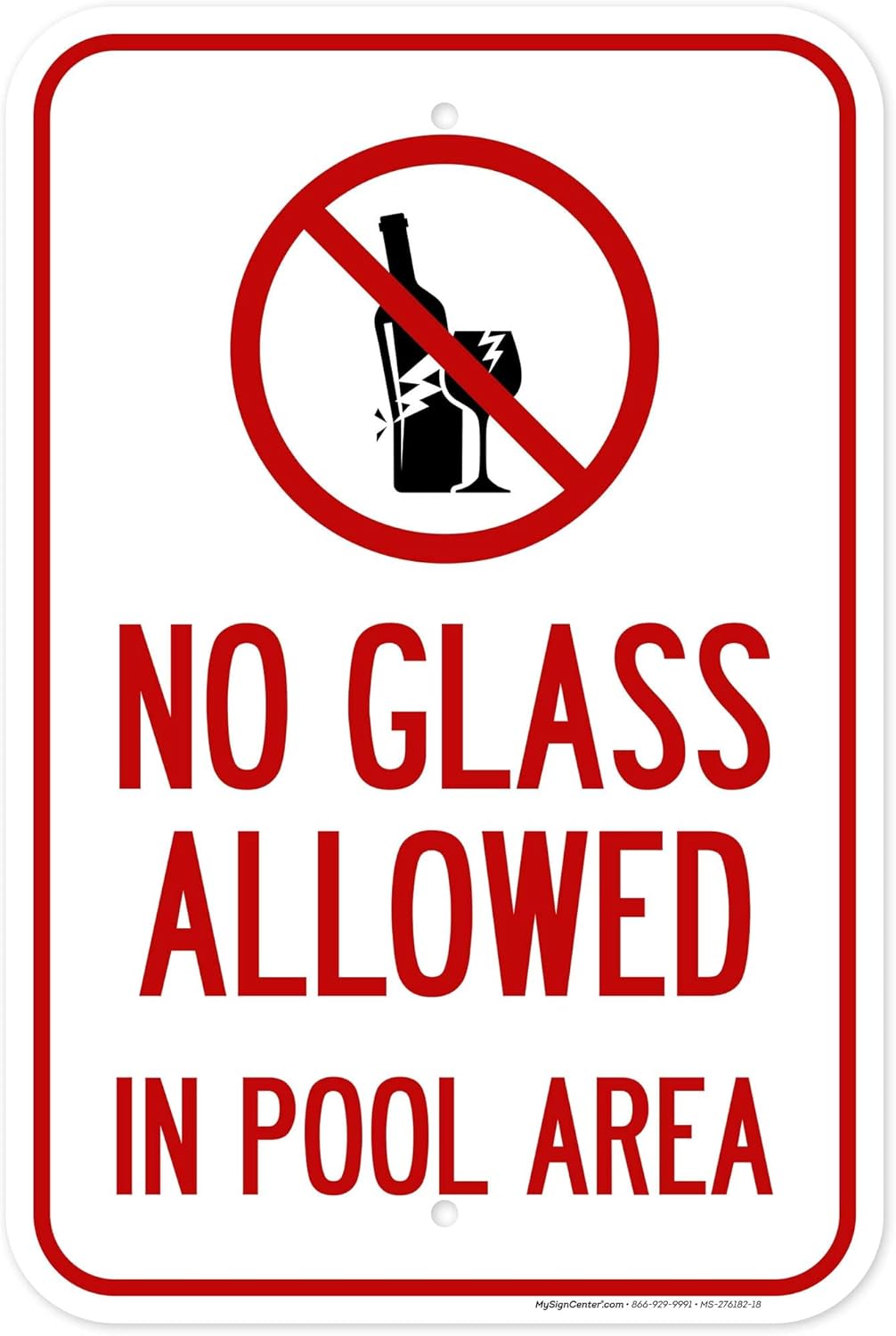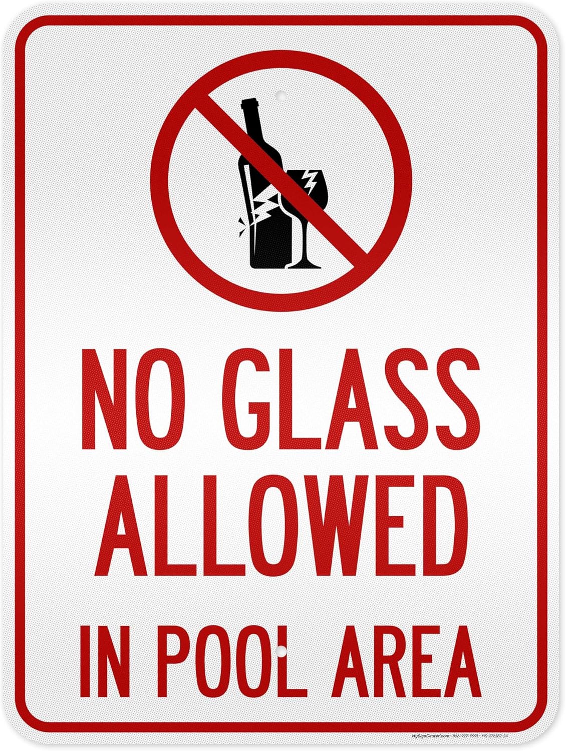 No Glass Allowed In Pool Area With Graphic Sign, 18x24 Inches, 55 mil thick HDPS (high density polystyrene), Made in USA by My Sign Center