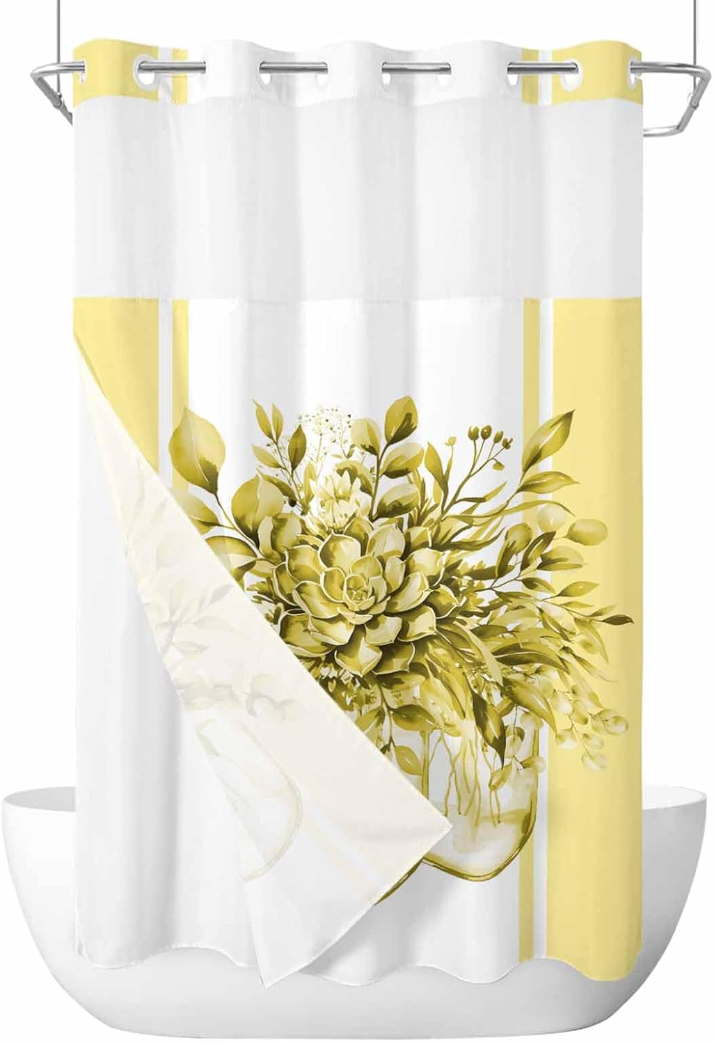 No Hook Shower Curtain with Snap in LinerDesign and AestheticsAesthetic colorful print artwork is original design by Edwiinsa, which is unique and with snap-in liner easily bring a luxury new look to your home, suitable for various home decor. The top window is a clever touch, allowing light to filter through and air to circulate, while maintaining privacy, creating a spa shower experience. It adds a nice, airy element to the space, making your shower feel less closed-off.Functionality and PracticalityThe no-hook feature is a game-changer—it’s so easy to install! The built-in rings glide smoothly over the shower rod, and the curtain snaps in place without the hassle of traditional hooks. It's such a time-saver, and it looks much cleaner than dealing with a bunch of separate hooks. 2 magnets at bottom of the shower curtain to add extra weight and help keep this fabric shower curtain liner in place and reduce billowing, bring you an wonderful shower experience.Quality and DurabilityThe shower curtain and liner are made with high quality fabric, feels sturdy and durability, soft to the touch. Both shower curtain and liner set are water-repellent, effectively preventing water splashes and keeping your bathroom floor dry.Ease of MaintenanceRemovable Inner Liner Design, maintaining this shower curtain set is a breeze. The snap-on fabric shower curtain liner is easily detachable for washing without taking the whole curtain down, keeping it clean and beautiful. The shower curtain and liner can be machine or hand-washed to keep it clean.