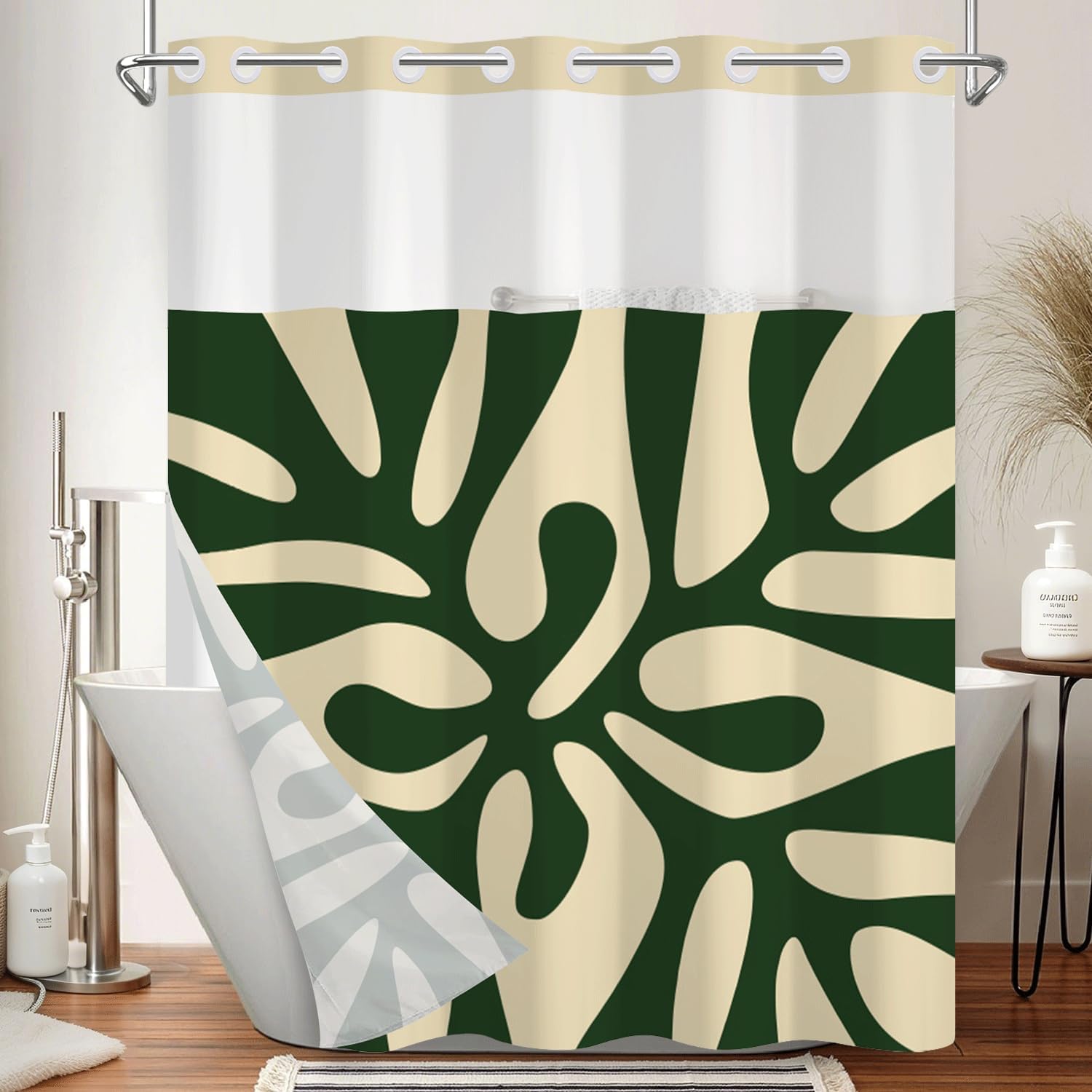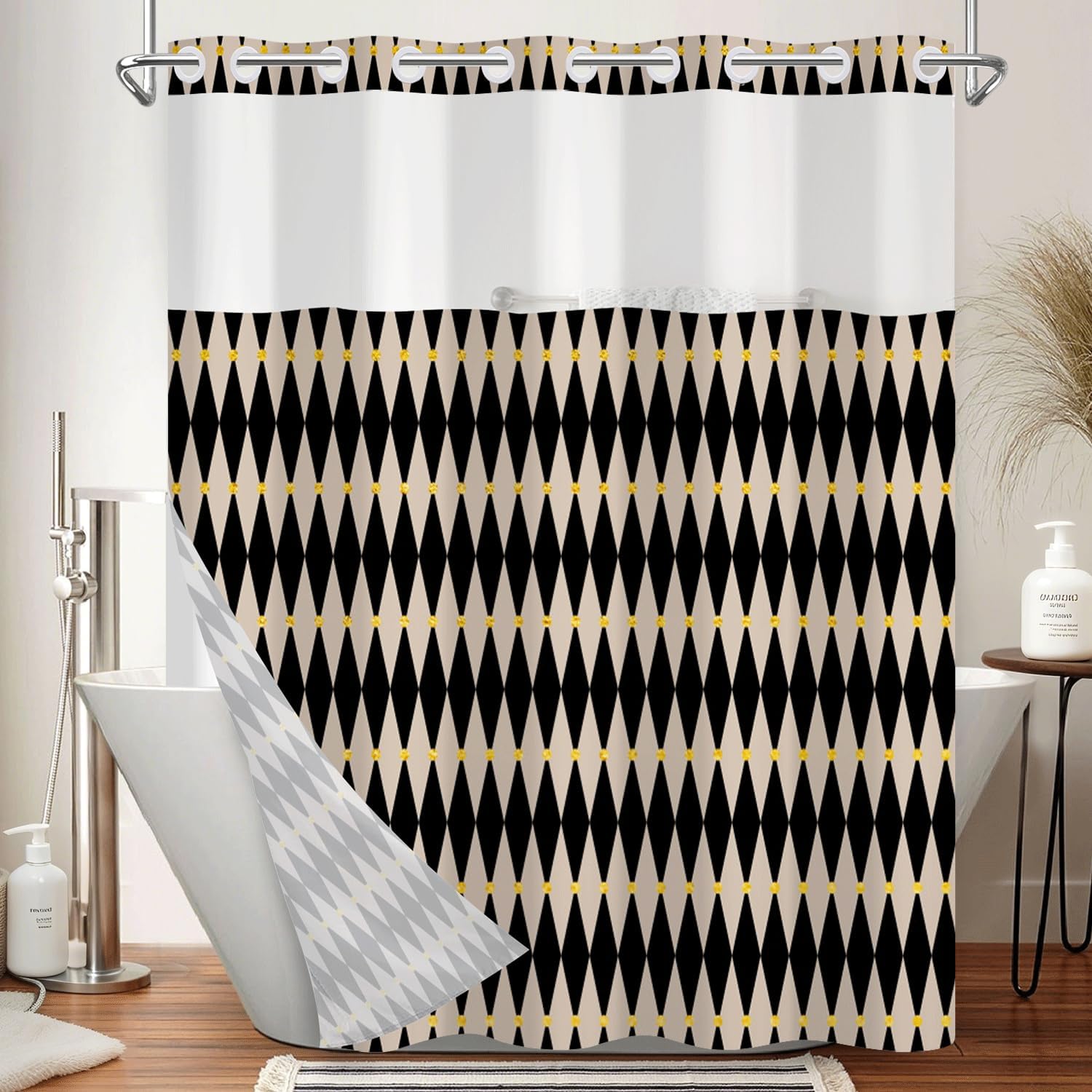 【All in One Shower Curtain and Liner】: The curtain is transparent near the top, which lets light in but still keeps things private. The built-in hooks make it really easy to hang—no need to deal with separate rings. It repels water well by using a liner for extra protection