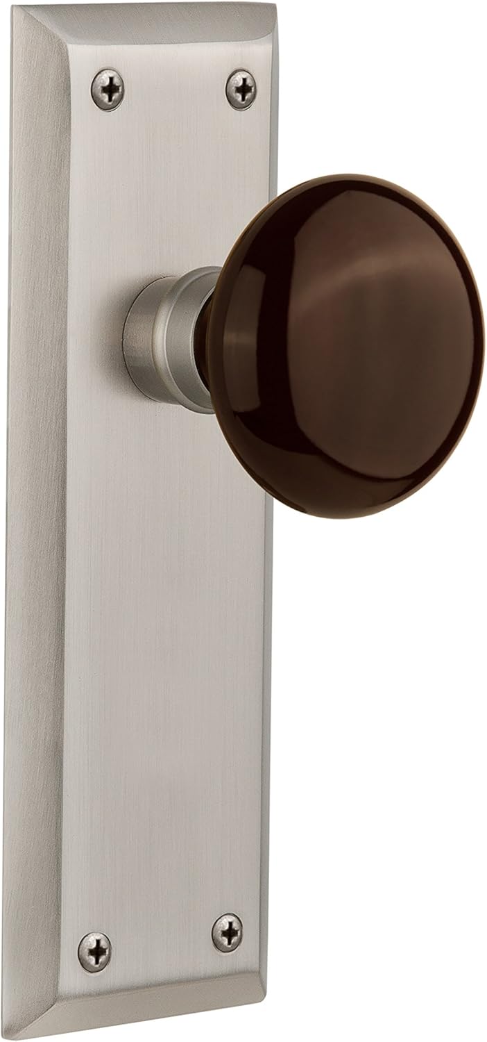 The clean lines and tailored style of the new York plate give a distinctive look that will last for years. Adding our rich, brown porcelain door knob only serves to compliment the warm, earthen hues in your home. All Nostalgic Warehouse door knobs are mounted on a solid (not plated) forged brass base for durability and beauty.