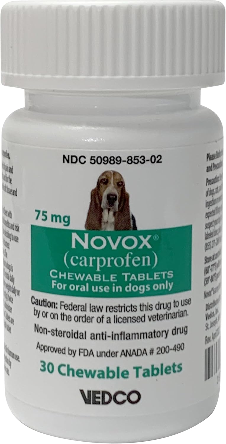 | Directions | The recommended dosage for oral administration to dogs in 2 mg/lb of body weight daily. The total daily dose may administered as 2 mg/lb of body weight once daily or divided and administered as 1 mg/lb twice daily. For the control of postoperative pain, administer approximately hours before the procedure. Novox Chewable Tablets are scored and dosage should be calculated in half-tablet increments. Tablets can be halved by placing the tablet on a hard surface and pressing down on both sides of the score. These liver flavored Novox chewable tablets may be offered to the dog by hand or placed on food. Care should be taken to ensure that the dog comsumes the complete dose. |