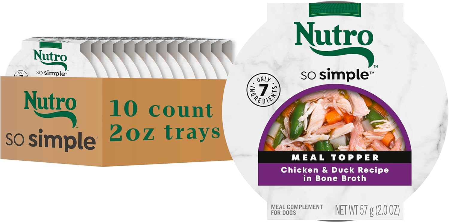 Your dog will do a happy dance when you feed them Nutro So Simple Wet Dog Meal Complement as a mix-in, topper or snack! This natural dog food is made with 7 ingredients or less, including real chicken and duck. Duck and chicken dog food topper made without grains and containing no chicken by-product meal, corn, wheat or soy, and no artificial flavors*, colors* or preservatives*, your dog will love this quality recipe. These delicious meal toppers for dogs start with high-quality protein as the first ingredient so pet parents can feel great about keeping it simple with only a handful of ingredients and lots of flavor.* Trace amounts may be present due to potential cross-contact during manufacturing.